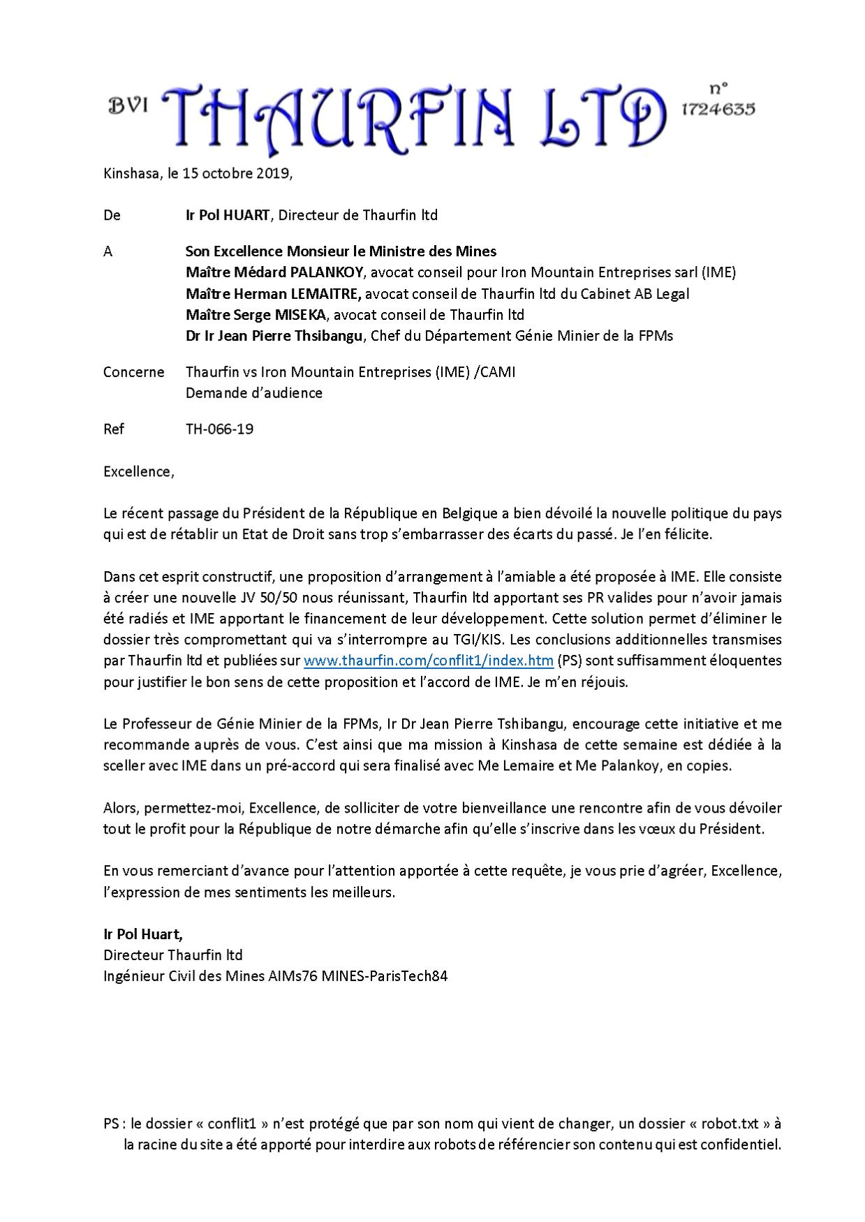 De bonne foi, je transmet la bonne nouvelle à son Excellence le Ministre des Mines par la lettre TH-