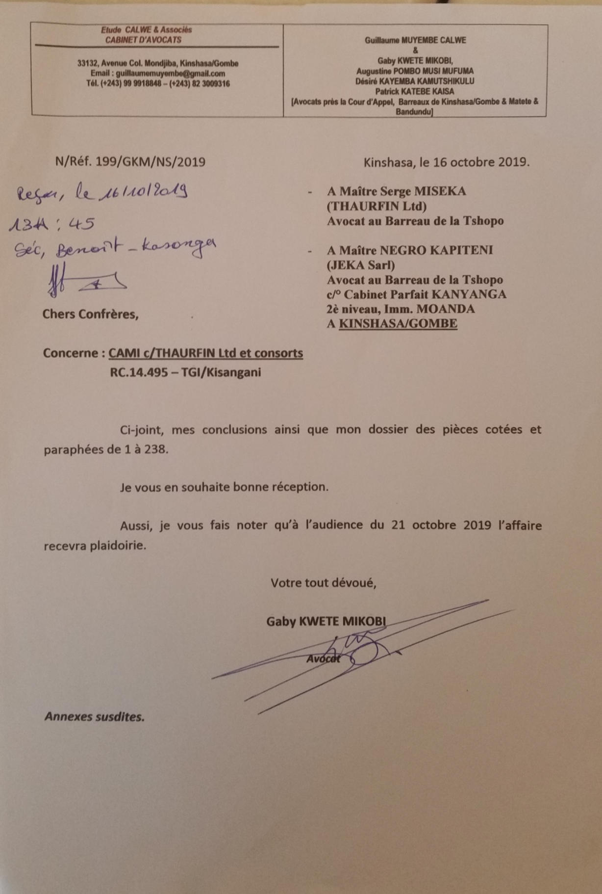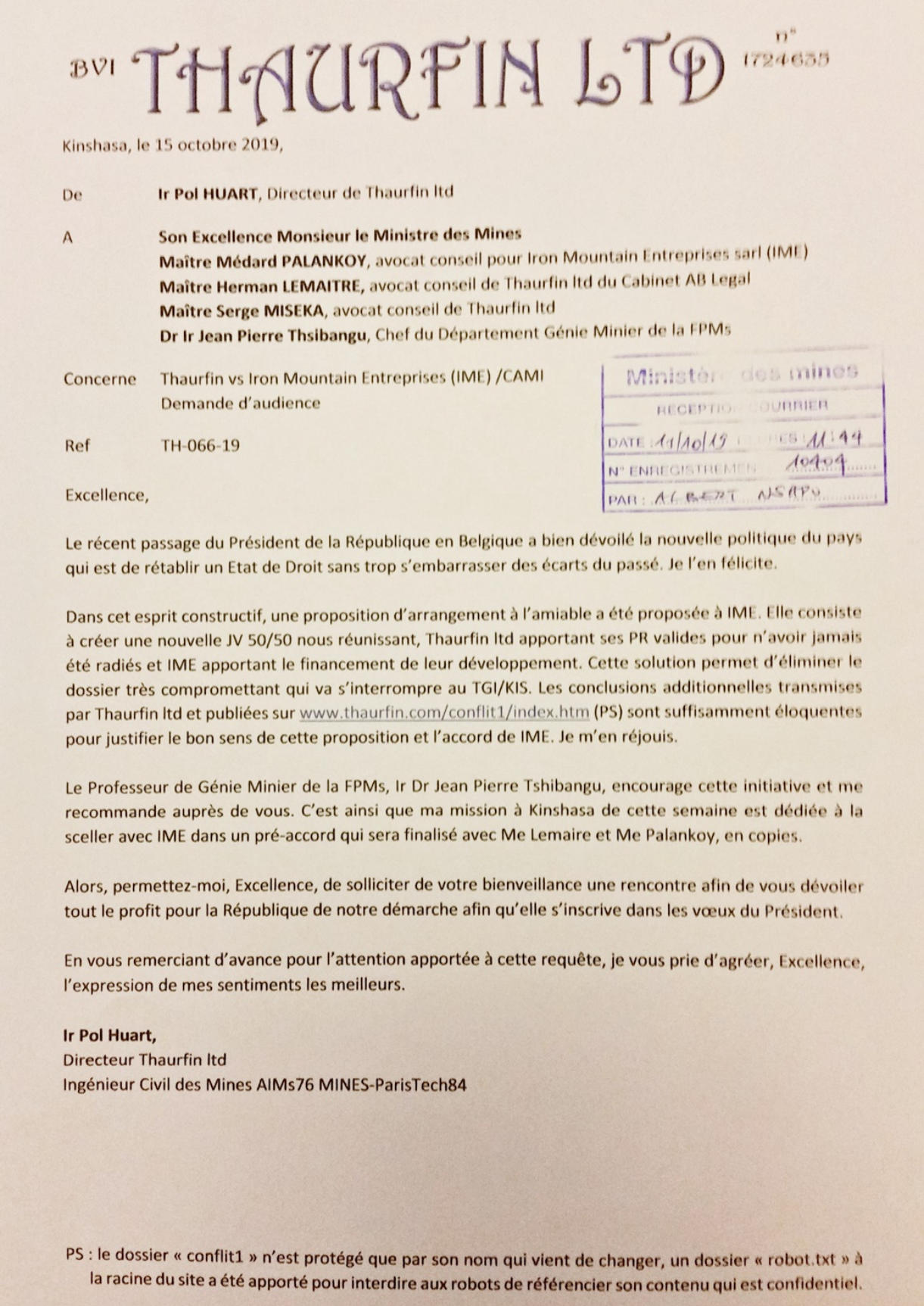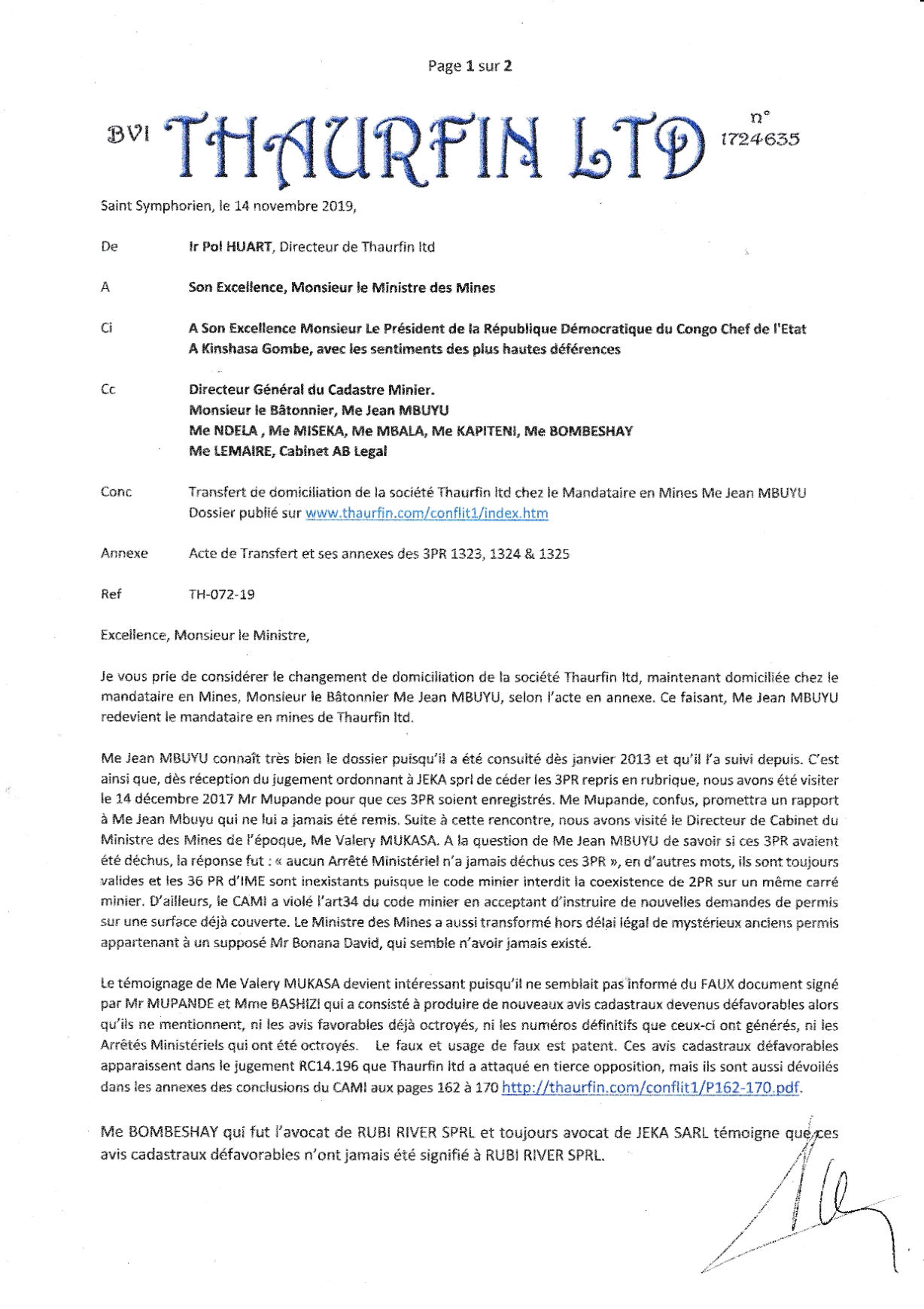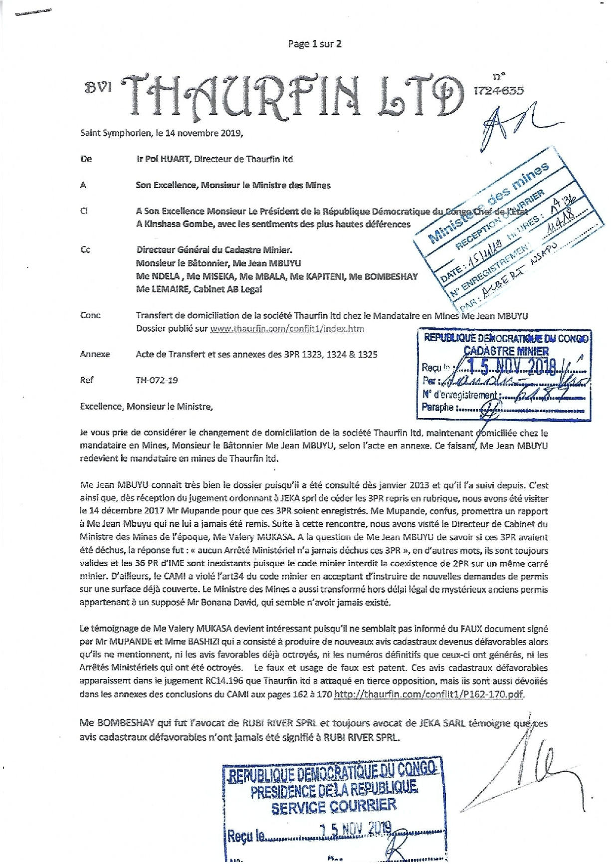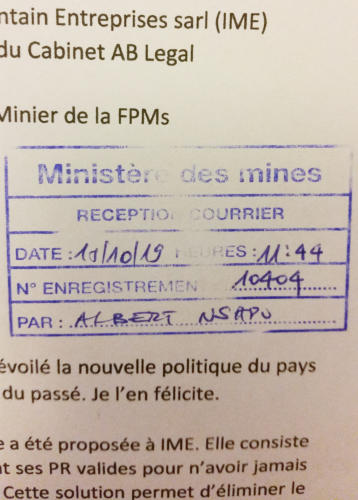 Ministre des Mines, en copie à la Présidence, au CAMI, à IME à nos avocats par le lettre TH-072-19 (calque) qui a reçu les accusés