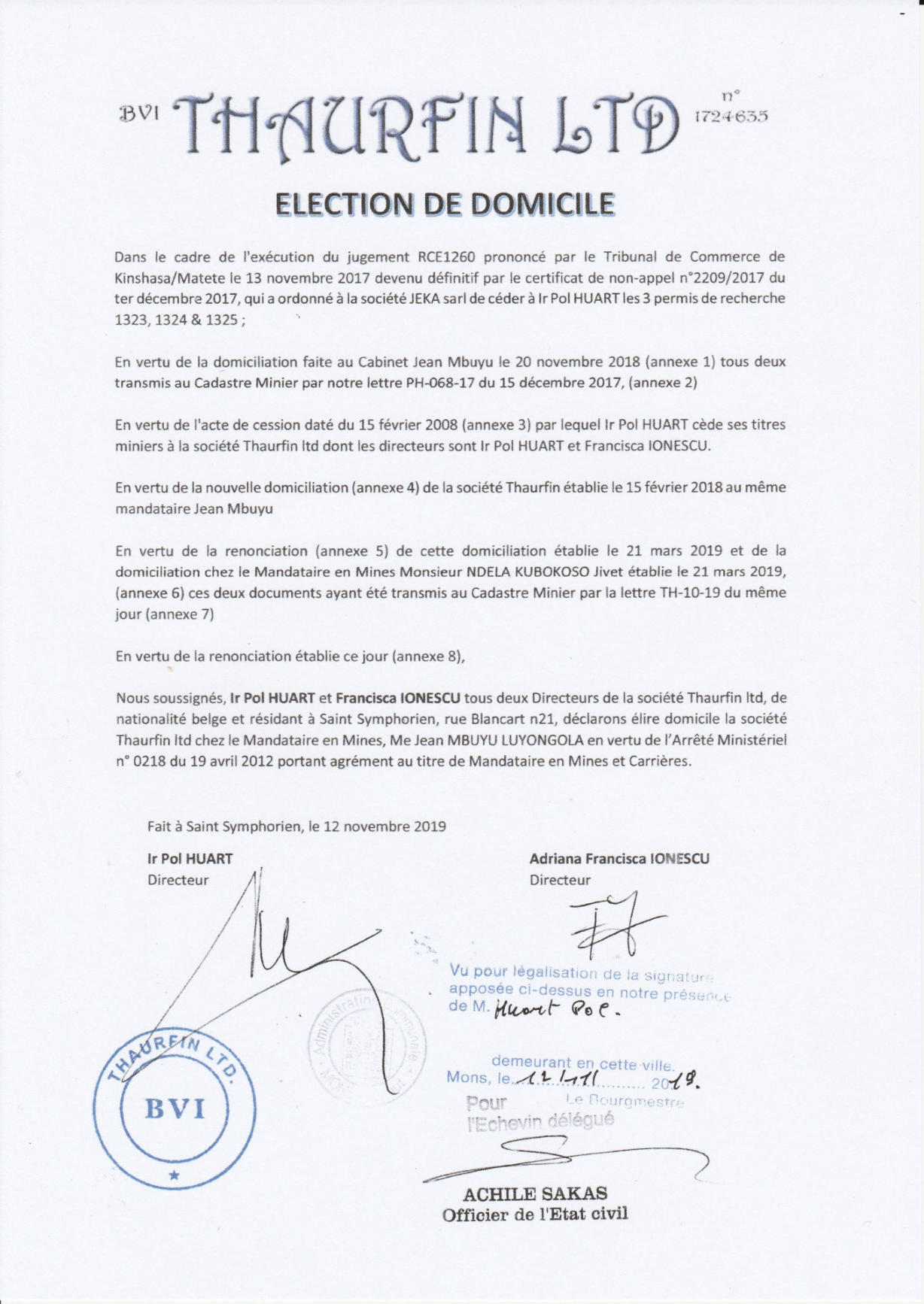 le Bâtonnier Jean Mbuyu redevient le mandataire en mines de Thaurfin ltd (calque). Cet acte de domiciliation a été transmis au
