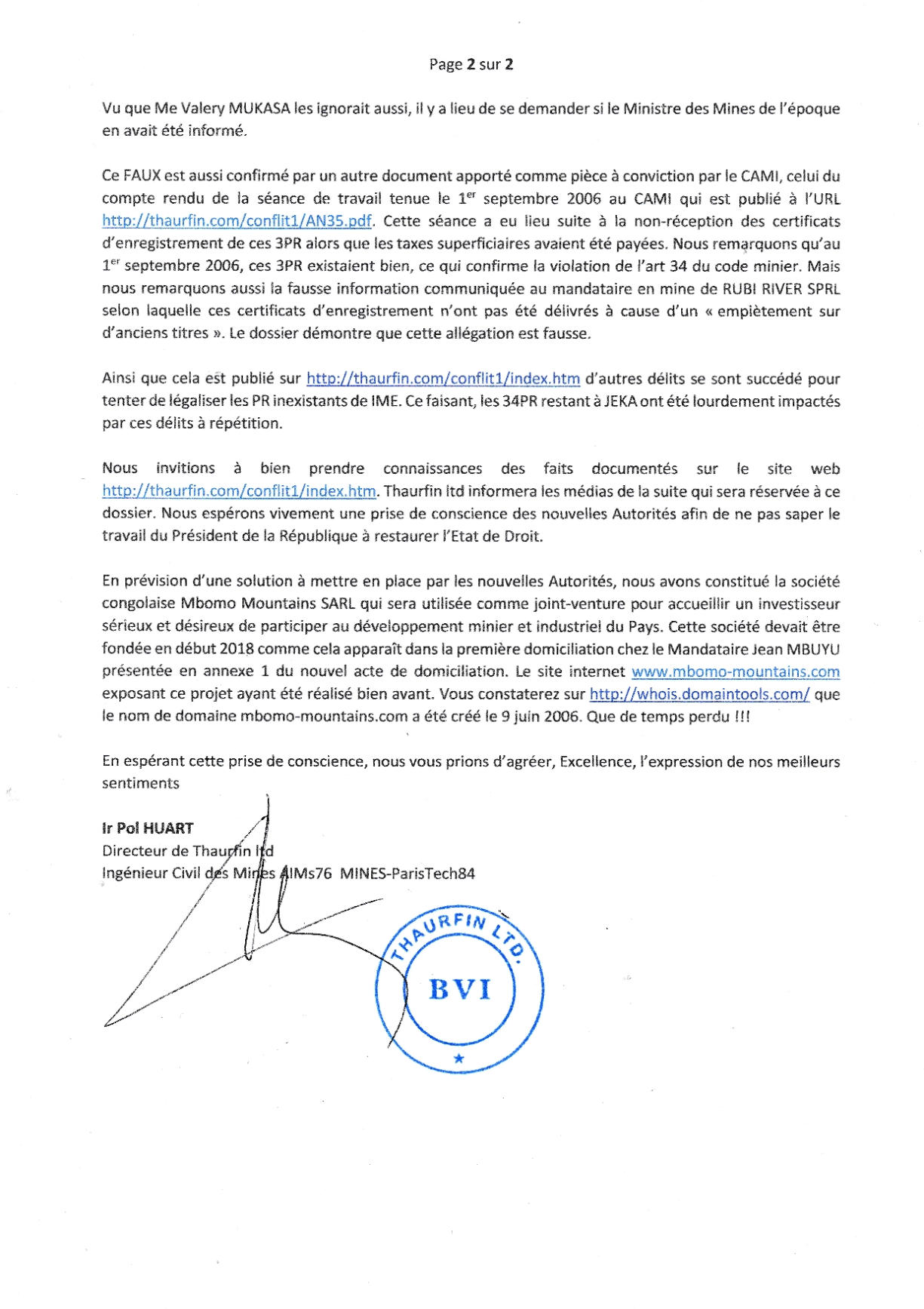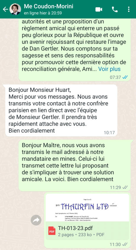 du Mandataire en Mines qui s’est chargé de transmettre ces répliques avec un texte rédigé par le DG de Thaurfin ltd. (Cf page