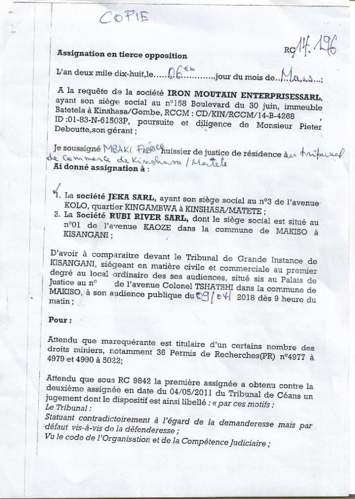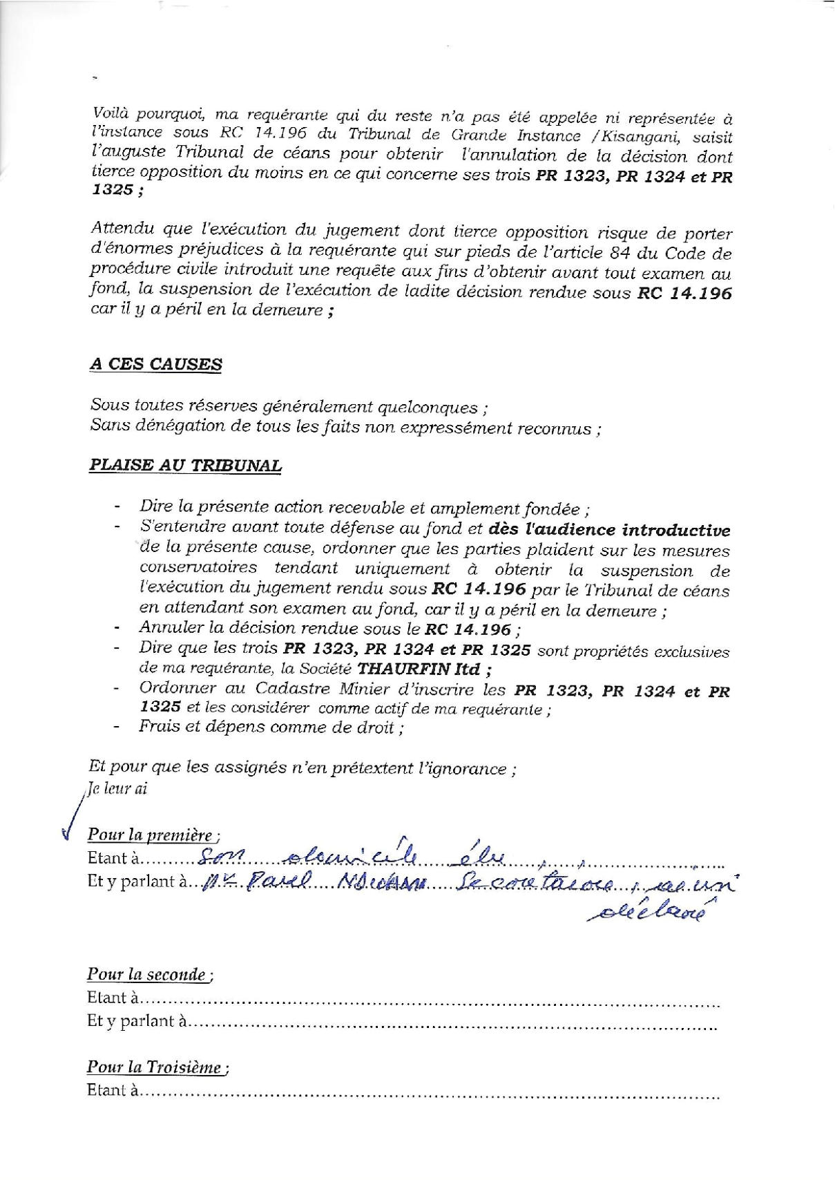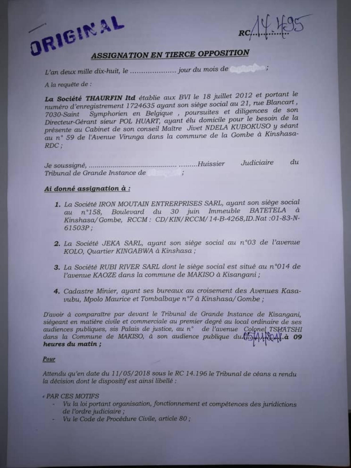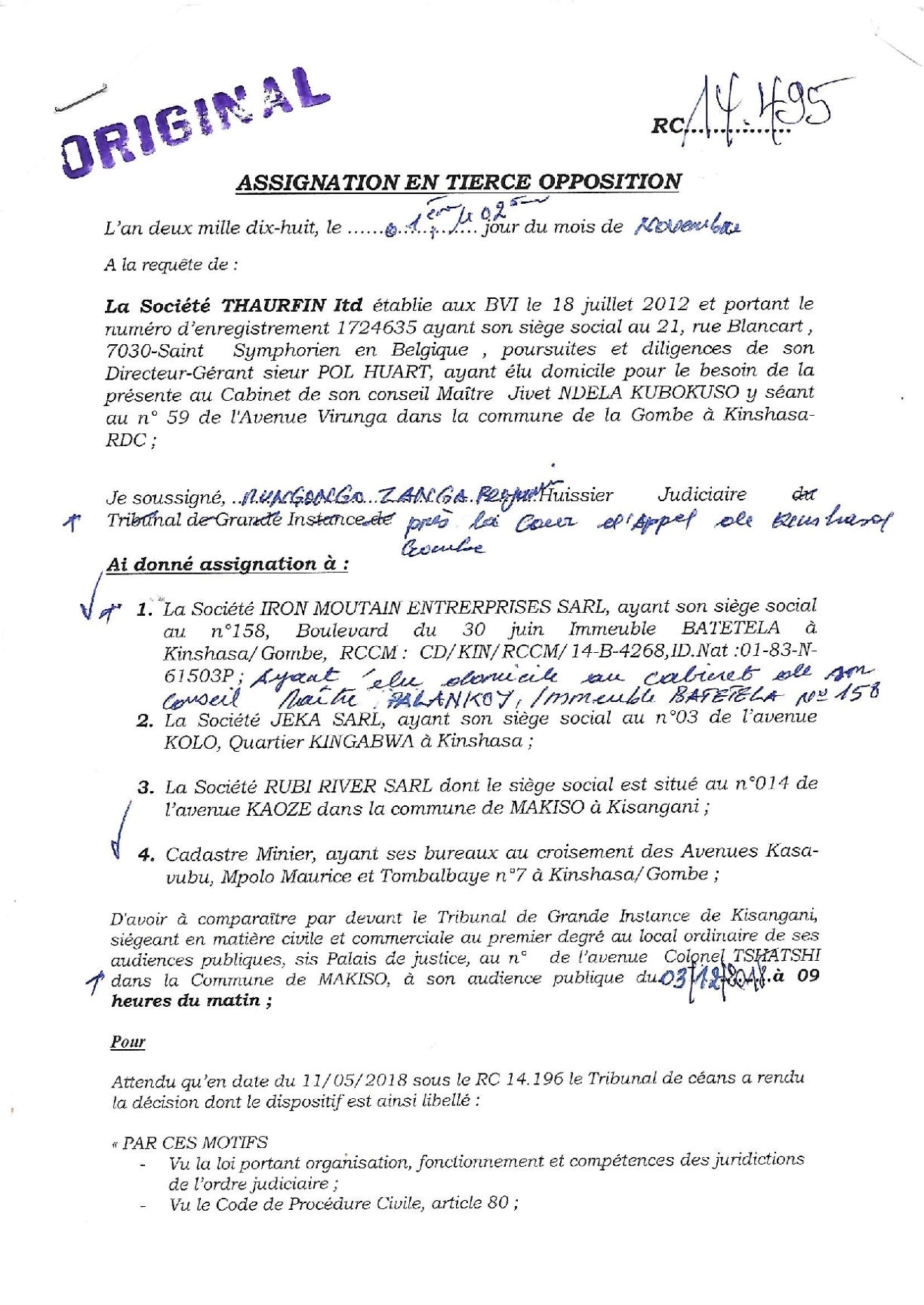 Thaurfin ltd, par son avocat Me Jivet NDELA, a donné assignation en tierce opposition le 15 octobre 2018 à IME, JEKA, Rubi River et le CAMI à comparaître à l’audience du 5 novembre 2018, L’adresse de l’assignation est celle de son siège social qui a été indiquée sur l’assignation en tierce opposition (calque) déposée par Pieter Deboutte, càd n°158, Boulevard du 30 juin, immeuble Batatela, Kinshasa Gombe (sans préciser le n° d’appartement ou l’étage)Selon cette assignation, la première audience devait avoir lieu le 5 novembre 2018. A cette audience, toutes les parties n’avaient pas été signifiées correctement. L’audience a été reportée au 5 décembre 2018. Le 30 novembre, la synthèse TH48 bien documentée est transmise.Les assignations ont été transmises et signées dans les règles, L’assignation signée par IME (calque) le 1er novembre 2018 pour l’audience du 3 décembre est très intéressante, car, en plus de l’adresse du siège social l’huissier en charge de remettre les assignations et faire signer un accusé de réception ajoute “la société Iron Mountains Entreprises ..... ayant élu domicile au cabinet de son conseil Maître Palankoy, immeuble Batetela, n°158” ... sans préciser le n° d’appartement ou l’étage. Mais le cachet de réception de Me Palankoy précise que le bureau est situé au 1er étage.QUESTION : Le domicile de IME n’est il pas dans un autre appartement, c’est à dire à une autre adresse que celle de son siège social?Cette séance a de nouveau été reportée, au 7 janvier 2019, les assignations signées à Kinshasa n’ayant pas été transmises au Tribunal.Vu la coupure d’Internet, un dossier complet a été envoyé par DHL à Me Kapiteni.▪DHL (voir calque)▪rapport TH-001-19 (PDF) (ou siteweb avec calque)▪3 clés USB contenant tout le dossierLa séance du 7 janvier a été reportée au 7 février pour un problème de signification de l’assignation, elle même reportée au 11 mars.Cette séance du 11 mars a de nouveau été reportée, IME ayant invoqué de ne pas être domicilée à l’adresse figurant sur leur propre assignation en tierce opposition.Le code de procédure apporte une solution à cette situation où la signification ne peut être exécutée ni au Siège Social ni à un associé.L’assignation de tierce opposition doit être affichée aux valves du Tribunal pendant 3 mois francs avant la prochaine séance qui aura lieu le 17 juin 2019 et doit être publiée au Journal Officiel.L’affichage a eu lieu le 15 mars (photo1 et photo2), la publication a été demandée officiellement par la lettre du 30 mars 2019.Les recherches entreprises pour localiser le siège social nous apportent des informations intéressantes :•En date du 6 novembre 2018, un PV d’AG de IME (calque - PDF) est établi selon lequeloPieter Deboutte reste le gérantoL’associé unique qui était Iron Mountain Entreprises ltd aux BVI (sous sancitons US) est remplacé par la sarl congolaise GEMINI sasu (société par Actions Simplifiée Unipersonnelle )oLe siège social peut être transféré à tout endroit de la RDC, sans autre précision.•la fiche de renseignements relative à IME (calque - PDF) communique l’adresse physique de son dirigeant (Pieter) Albert Maurice Deboutte•Les statuts de GEMINI sasu sont intéressants (PDF 18pages) , oLa société GEMINI sasu est dirigée (p11) par le Président Alain Mukonda Mayandu (profil Linkedin)oSon unique associé est une société appelée OPERA sasu domiciliée à Kinshasa 8ème étage, immeuble 1113, Bouvevard du 30 juin, n°110, à Kinshasa/Gombe, la page d’introduction des statuts est intéressante (calque - PDF)•La fiche de renseignements relative à GEMINI sasu (calque - PDF) communique l’adresse physique de son dirigeant Alain Mukonda Mayandu Le 17 juin 2019, le TGI/KIS est régulièrement saisi. L’audience est renvoyée au 5 aout 2019 pour plaidoirie de fond.Le 2 juillet 2019, rencontre à Paris avec Me Cédric Fischer. Me Fischer a demandé des informations sur la procédure à Me Kapita qui informera Me Fischer qu’il préparait les conclusions de Thaurfin sans que son client n’en soit informé. Lé 10 juillet 2019, Me Ndela me fait parvenir un mail (PDF) avec sa proposition de conclusions (PDF)Le 21 juillet 2019, mail de réponse (Mail à Mr Mupande PDF) à Mr Mupande suite à la transmission tardive par Me Ndela de la lettre du CAMI datée du 29 avril 2019 (PDF). Mr Mupande répondait à la communication du transfert de domiciliation chez le mandataire en mines Jivet NDELA (PDF TH-010-19)Thaurfin est en conflit avec son avocat Me Jivet NDELA qui refuse de transmettre les conclusions exigée par son client Le 22 juillet 2019, des annexes exhaustives aux conclusions additionneles sont imprimées et reliées (PDF) Le 1er aout 2019, 2 procurations spéciales (PDF) sont signées pour Me Negro Kapiteni et Me Alain Kangakoto, tous d’eux Avocat au Barreau de la Tshopo et une domiciltation au cabinet du Bâtonnier BORIKANA est signée (PDF). Le 2 aout 2019, Johnny Flament fait parvenir une procuration spéciale à Me Michel Benoni (PDF) et une domiciliation (PDF)Le 5 aout 2019, ni IME, ni le CAMI n’ont remis leurs conclusions. Ni Me Kapita, ni Me Ndela ne sont à cette audience du 5 aout. Me Negro Kapiteni et Alain Kangakoto représentent Thaurfin ltd et Me Benoni représentait JEKA. Le Tribunal est saisi et l’audience est reportée le 21 octobre 2019 après les congés judiciaires. Les annexes de 330 pages à des conclusions additionnelles sonts apportées à Kisangani lors du séjour du 30 septembre au 6 aout de Ir Pol Huart. L’audience est reportée au 21 octobre 2019.Le 9 aout 2019, le mail est envoyé aux parties concernées pour informer de la rupture d’assistance juridique avec Me Jivet Ndela (PDF)Le 21 aout 2019, les conclusions sont remises au greffes du TGI/KIS (PDF accusé de réception) afin qu’elles soient transmis