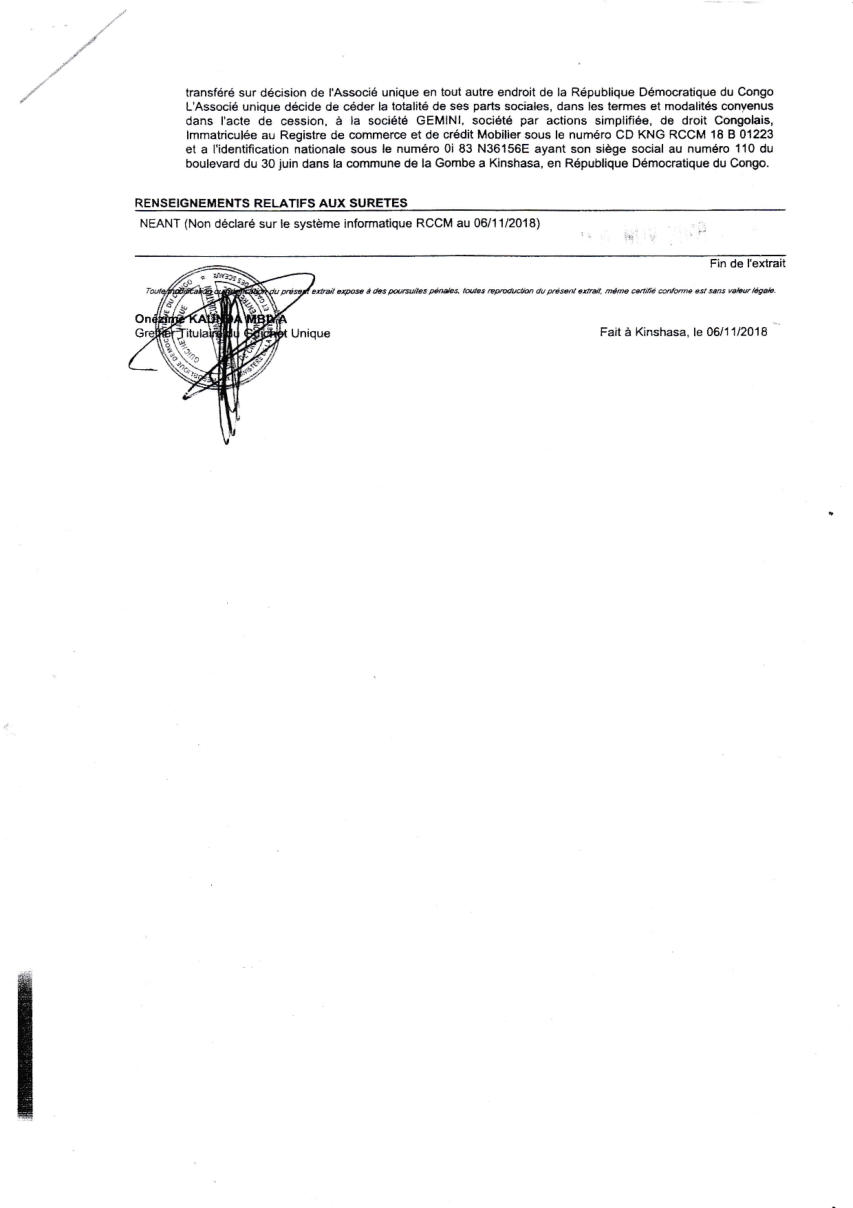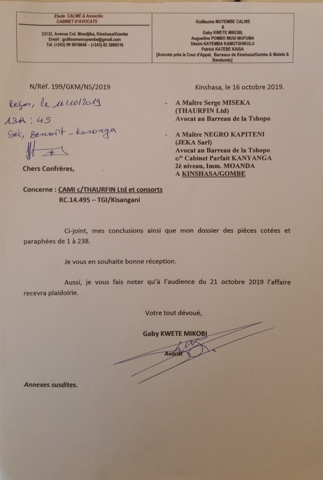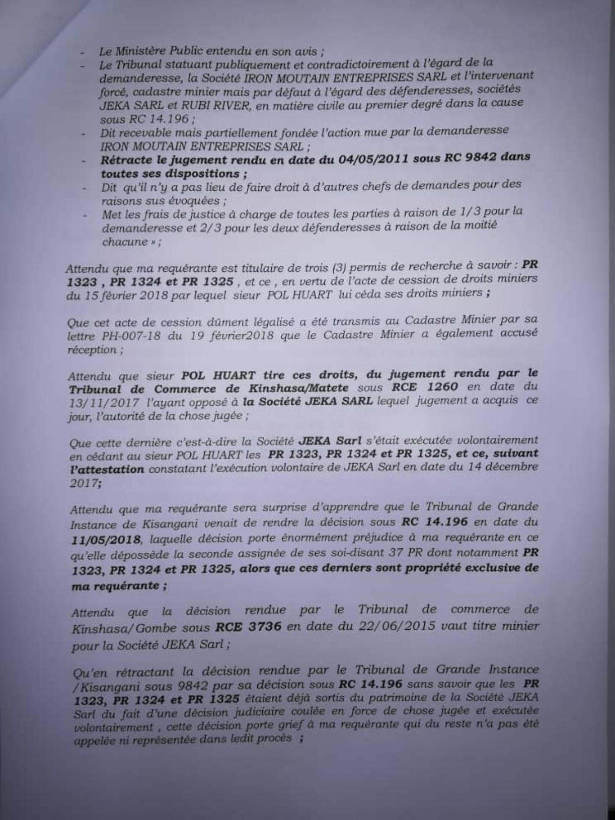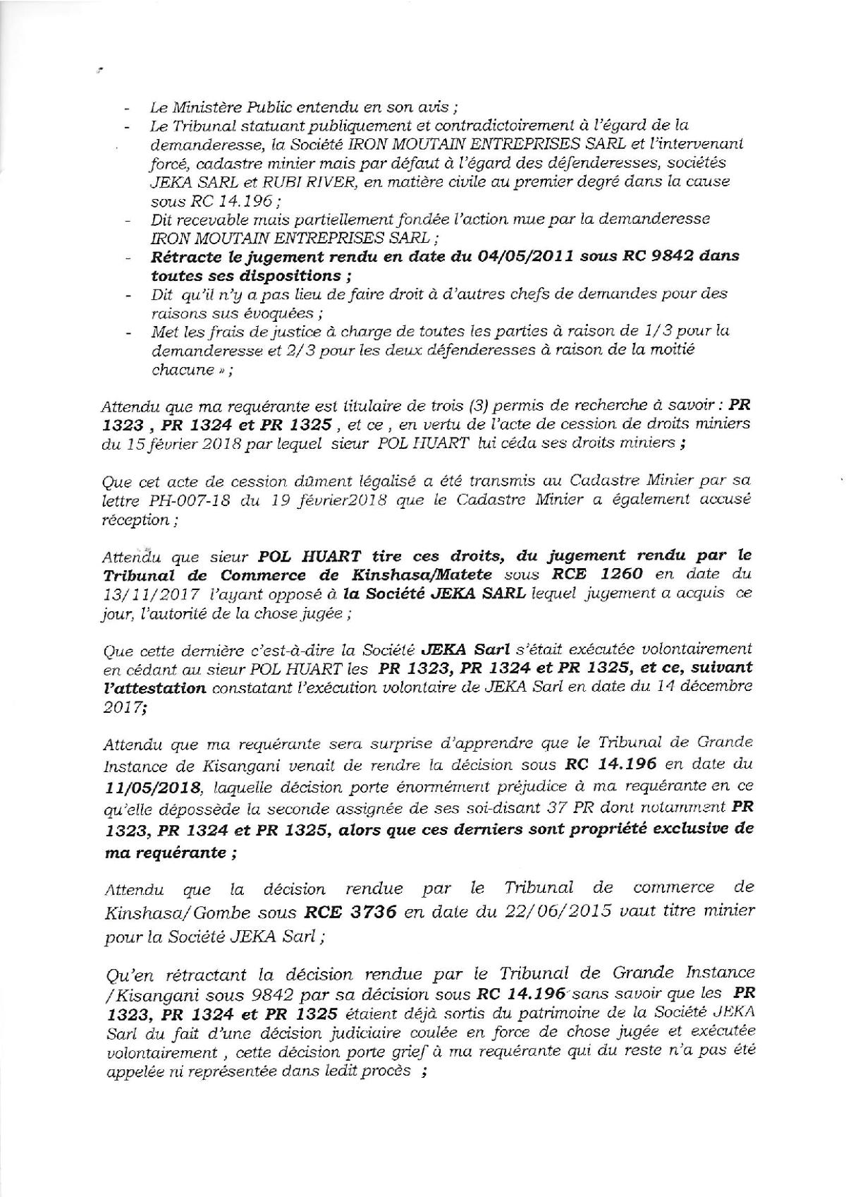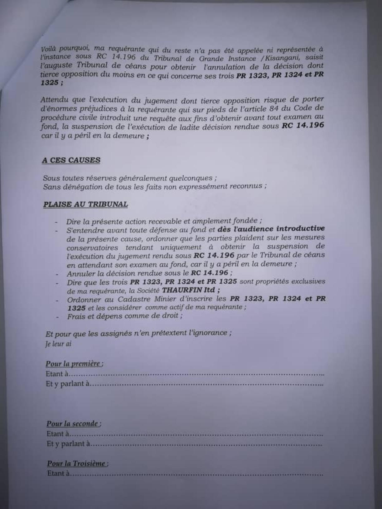 Thaurfin ltd, par son avocat Me Jivet NDELA, a donné assignation en tierce opposition le 15 octobre 2018 à IME, JEKA, Rubi River et le CAMI à comparaître à l’audience du 5 novembre 2018, L’adresse de l’assignation est celle de son siège social qui a été indiquée sur l’assignation en tierce opposition (calque) déposée par Pieter Deboutte, càd n°158, Boulevard du 30 juin, immeuble Batatela, Kinshasa Gombe (sans préciser le n° d’appartement ou l’étage)Selon cette assignation, la première audience devait avoir lieu le 5 novembre 2018. A cette audience, toutes les parties n’avaient pas été signifiées correctement. L’audience a été reportée au 5 décembre 2018. Le 30 novembre, la synthèse TH48 bien documentée est transmise.Les assignations ont été transmises et signées dans les règles, L’assignation signée par IME (calque) le 1er novembre 2018 pour l’audience du 3 décembre est très intéressante, car, en plus de l’adresse du siège social l’huissier en charge de remettre les assignations et faire signer un accusé de réception ajoute “la société Iron Mountains Entreprises ..... ayant élu domicile au cabinet de son conseil Maître Palankoy, immeuble Batetela, n°158” ... sans préciser le n° d’appartement ou l’étage. Mais le cachet de réception de Me Palankoy précise que le bureau est situé au 1er étage.QUESTION : Le domicile de IME n’est il pas dans un autre appartement, c’est à dire à une autre adresse que celle de son siège social?Cette séance a de nouveau été reportée, au 7 janvier 2019, les assignations signées à Kinshasa n’ayant pas été transmises au Tribunal.Vu la coupure d’Internet, un dossier complet a été envoyé par DHL à Me Kapiteni.▪DHL (voir calque)▪rapport TH-001-19 (PDF) (ou siteweb avec calque)▪3 clés USB contenant tout le dossierLa séance du 7 janvier a été reportée au 7 février pour un problème de signification de l’assignation, elle même reportée au 11 mars.Cette séance du 11 mars a de nouveau été reportée, IME ayant invoqué de ne pas être domicilée à l’adresse figurant sur leur propre assignation en tierce opposition.Le code de procédure apporte une solution à cette situation où la signification ne peut être exécutée ni au Siège Social ni à un associé.L’assignation de tierce opposition doit être affichée aux valves du Tribunal pendant 3 mois francs avant la prochaine séance qui aura lieu le 17 juin 2019 et doit être publiée au Journal Officiel.L’affichage a eu lieu le 15 mars (photo1 et photo2), la publication a été demandée officiellement par la lettre du 30 mars 2019.Les recherches entreprises pour localiser le siège social nous apportent des informations intéressantes :•En date du 6 novembre 2018, un PV d’AG de IME (calque - PDF) est établi selon lequeloPieter Deboutte reste le gérantoL’associé unique qui était Iron Mountain Entreprises ltd aux BVI (sous sancitons US) est remplacé par la sarl congolaise GEMINI sasu (société par Actions Simplifiée Unipersonnelle )oLe siège social peut être transféré à tout endroit de la RDC, sans autre précision.•la fiche de renseignements relative à IME (calque - PDF) communique l’adresse physique de son dirigeant (Pieter) Albert Maurice Deboutte•Les statuts de GEMINI sasu sont intéressants (PDF 18pages) , oLa société GEMINI sasu est dirigée (p11) par le Président Alain Mukonda Mayandu (profil Linkedin)oSon unique associé est une société appelée OPERA sasu domiciliée à Kinshasa 8ème étage, immeuble 1113, Bouvevard du 30 juin, n°110, à Kinshasa/Gombe, la page d’introduction des statuts est intéressante (calque - PDF)•La fiche de renseignements relative à GEMINI sasu (calque - PDF) communique l’adresse physique de son dirigeant Alain Mukonda Mayandu Le 17 juin 2019, le TGI/KIS est régulièrement saisi. L’audience est renvoyée au 5 aout 2019 pour plaidoirie de fond.Le 2 juillet 2019, rencontre à Paris avec Me Cédric Fischer. Me Fischer a demandé des informations sur la procédure à Me Kapita qui informera Me Fischer qu’il préparait les conclusions de Thaurfin sans que son client n’en soit informé. Lé 10 juillet 2019, Me Ndela me fait parvenir un mail (PDF) avec sa proposition de conclusions (PDF)Le 21 juillet 2019, mail de réponse (Mail à Mr Mupande PDF) à Mr Mupande suite à la transmission tardive par Me Ndela de la lettre du CAMI datée du 29 avril 2019 (PDF). Mr Mupande répondait à la communication du transfert de domiciliation chez le mandataire en mines Jivet NDELA (PDF TH-010-19)Thaurfin est en conflit avec son avocat Me Jivet NDELA qui refuse de transmettre les conclusions exigée par son client Le 22 juillet 2019, des annexes exhaustives aux conclusions additionneles sont imprimées et reliées (PDF) Le 1er aout 2019, 2 procurations spéciales (PDF) sont signées pour Me Negro Kapiteni et Me Alain Kangakoto, tous d’eux Avocat au Barreau de la Tshopo et une domiciltation au cabinet du Bâtonnier BORIKANA est signée (PDF). Le 2 aout 2019, Johnny Flament fait parvenir une procuration spéciale à Me Michel Benoni (PDF) et une domiciliation (PDF)Le 5 aout 2019, ni IME, ni le CAMI n’ont remis leurs conclusions. Ni Me Kapita, ni Me Ndela ne sont à cette audience du 5 aout. Me Negro Kapiteni et Alain Kangakoto représentent Thaurfin ltd et Me Benoni représentait JEKA. Le Tribunal est saisi et l’audience est reportée le 21 octobre 2019 après les congés judiciaires. Les annexes de 330 pages à des conclusions additionnelles sonts apportées à Kisangani lors du séjour du 30 septembre au 6 aout de Ir Pol Huart. L’audience est reportée au 21 octobre 2019.Le 9 aout 2019, le mail est envoyé aux parties concernées pour informer de la rupture d’assistance juridique avec Me Jivet Ndela (PDF)Le 21 aout 2019, les conclusions sont remises au greffes du TGI/KIS (PDF accusé de réception) afin qu’elles soient transmis