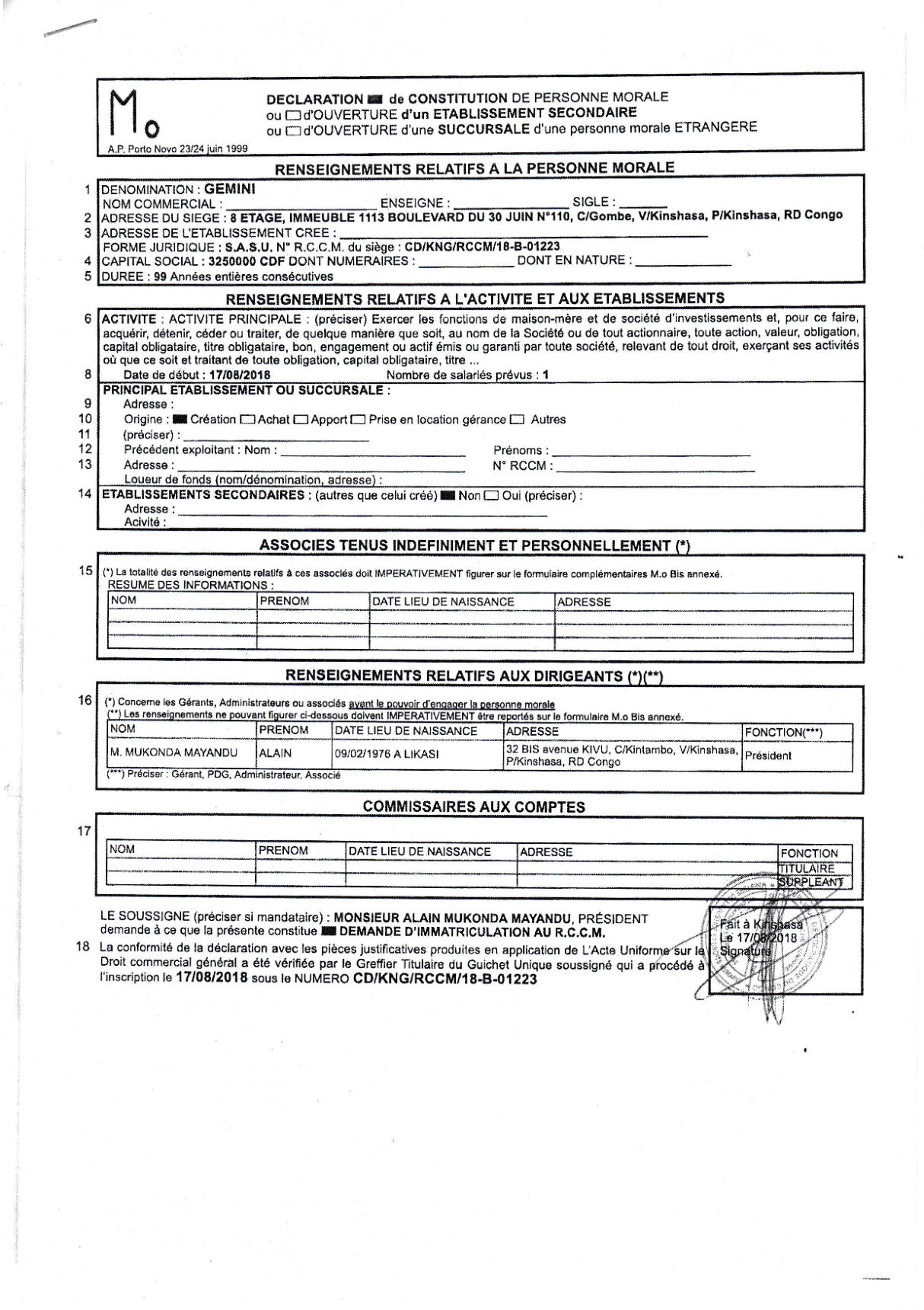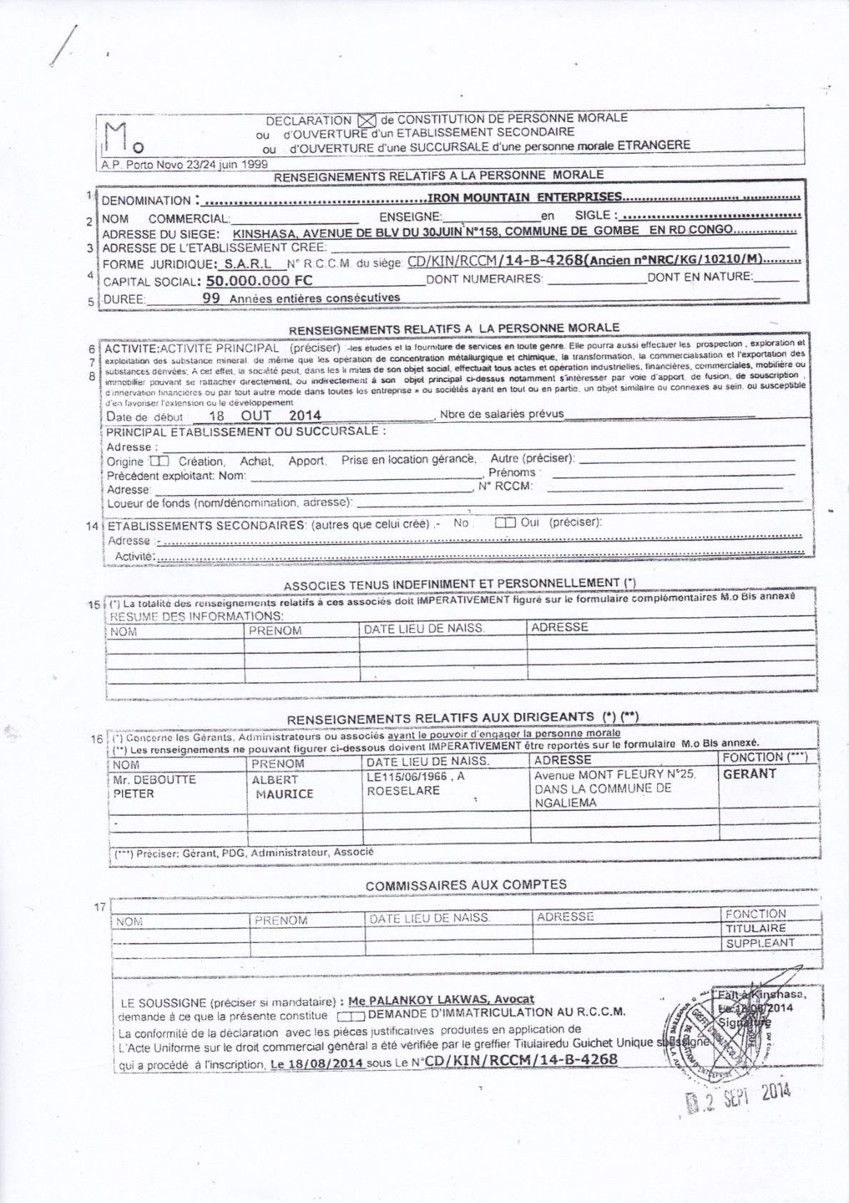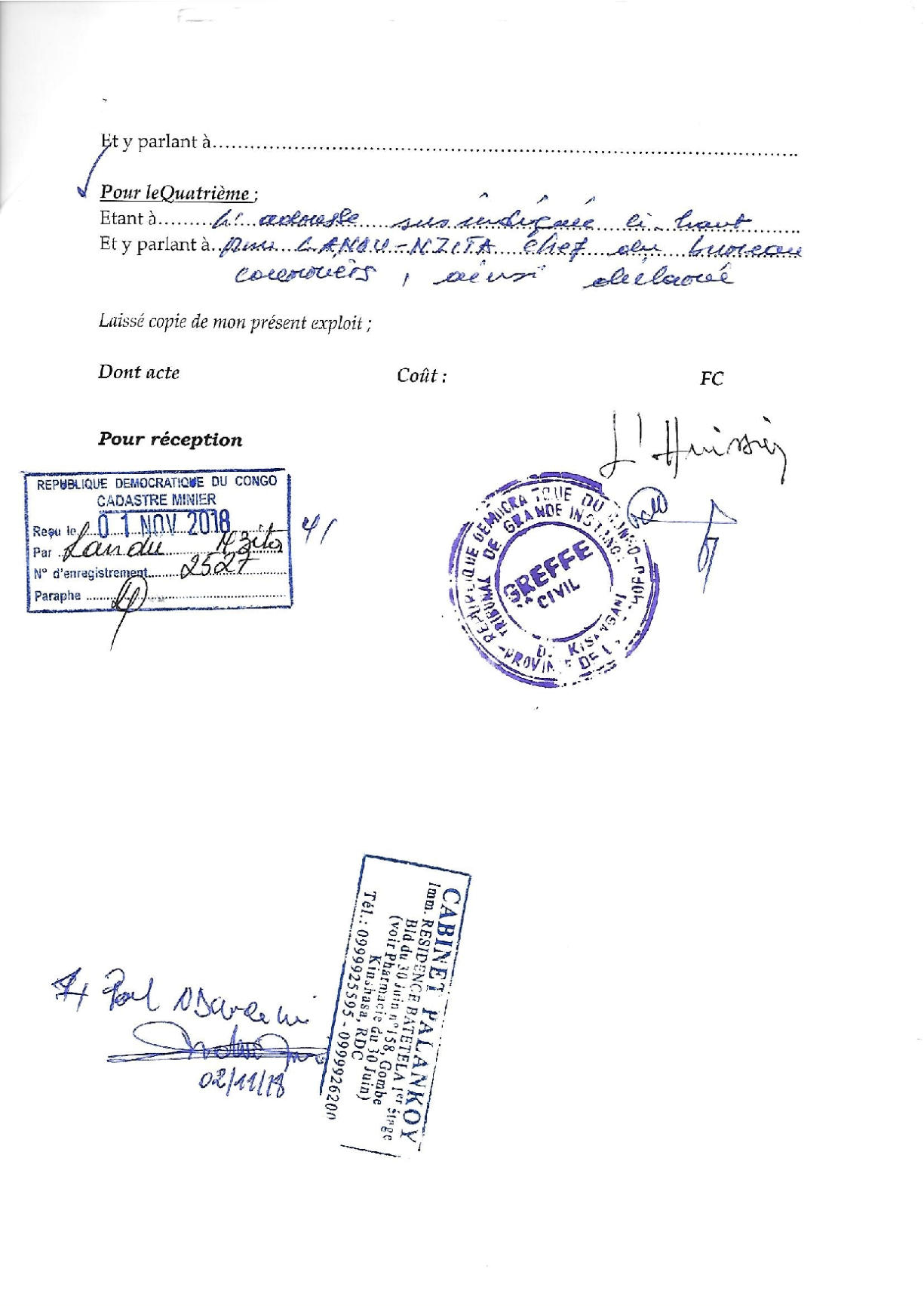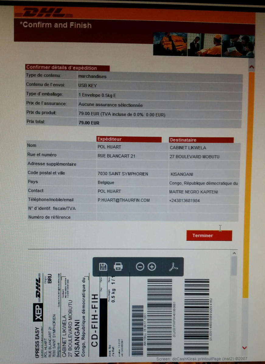 Thaurfin ltd, par son avocat Me Jivet NDELA, a donné assignation en tierce opposition le 15 octobre 2018 à IME, JEKA, Rubi River et le CAMI à comparaître à l’audience du 5 novembre 2018, L’adresse de l’assignation est celle de son siège social qui a été indiquée sur l’assignation en tierce opposition (calque) déposée par Pieter Deboutte, càd n°158, Boulevard du 30 juin, immeuble Batatela, Kinshasa Gombe (sans préciser le n° d’appartement ou l’étage)Selon cette assignation, la première audience devait avoir lieu le 5 novembre 2018. A cette audience, toutes les parties n’avaient pas été signifiées correctement. L’audience a été reportée au 5 décembre 2018. Le 30 novembre, la synthèse TH48 bien documentée est transmise.Les assignations ont été transmises et signées dans les règles, L’assignation signée par IME (calque) le 1er novembre 2018 pour l’audience du 3 décembre est très intéressante, car, en plus de l’adresse du siège social l’huissier en charge de remettre les assignations et faire signer un accusé de réception ajoute “la société Iron Mountains Entreprises ..... ayant élu domicile au cabinet de son conseil Maître Palankoy, immeuble Batetela, n°158” ... sans préciser le n° d’appartement ou l’étage. Mais le cachet de réception de Me Palankoy précise que le bureau est situé au 1er étage.QUESTION : Le domicile de IME n’est il pas dans un autre appartement, c’est à dire à une autre adresse que celle de son siège social?Cette séance a de nouveau été reportée, au 7 janvier 2019, les assignations signées à Kinshasa n’ayant pas été transmises au Tribunal.Vu la coupure d’Internet, un dossier complet a été envoyé par DHL à Me Kapiteni.▪DHL (voir calque)▪rapport TH-001-19 (PDF) (ou siteweb avec calque)▪3 clés USB contenant tout le dossierLa séance du 7 janvier a été reportée au 7 février pour un problème de signification de l’assignation, elle même reportée au 11 mars.Cette séance du 11 mars a de nouveau été reportée, IME ayant invoqué de ne pas être domicilée à l’adresse figurant sur leur propre assignation en tierce opposition.Le code de procédure apporte une solution à cette situation où la signification ne peut être exécutée ni au Siège Social ni à un associé.L’assignation de tierce opposition doit être affichée aux valves du Tribunal pendant 3 mois francs avant la prochaine séance qui aura lieu le 17 juin 2019 et doit être publiée au Journal Officiel.L’affichage a eu lieu le 15 mars (photo1 et photo2), la publication a été demandée officiellement par la lettre du 30 mars 2019.Les recherches entreprises pour localiser le siège social nous apportent des informations intéressantes :•En date du 6 novembre 2018, un PV d’AG de IME (calque - PDF) est établi selon lequeloPieter Deboutte reste le gérantoL’associé unique qui était Iron Mountain Entreprises ltd aux BVI (sous sancitons US) est remplacé par la sarl congolaise GEMINI sasu (société par Actions Simplifiée Unipersonnelle )oLe siège social peut être transféré à tout endroit de la RDC, sans autre précision.•la fiche de renseignements relative à IME (calque - PDF) communique l’adresse physique de son dirigeant (Pieter) Albert Maurice Deboutte•Les statuts de GEMINI sasu sont intéressants (PDF 18pages) , oLa société GEMINI sasu est dirigée (p11) par le Président Alain Mukonda Mayandu (profil Linkedin)oSon unique associé est une société appelée OPERA sasu domiciliée à Kinshasa 8ème étage, immeuble 1113, Bouvevard du 30 juin, n°110, à Kinshasa/Gombe, la page d’introduction des statuts est intéressante (calque - PDF)•La fiche de renseignements relative à GEMINI sasu (calque - PDF) communique l’adresse physique de son dirigeant Alain Mukonda Mayandu Le 17 juin 2019, le TGI/KIS est régulièrement saisi. L’audience est renvoyée au 5 aout 2019 pour plaidoirie de fond.Le 2 juillet 2019, rencontre à Paris avec Me Cédric Fischer. Me Fischer a demandé des informations sur la procédure à Me Kapita qui informera Me Fischer qu’il préparait les conclusions de Thaurfin sans que son client n’en soit informé. Lé 10 juillet 2019, Me Ndela me fait parvenir un mail (PDF) avec sa proposition de conclusions (PDF)Le 21 juillet 2019, mail de réponse (Mail à Mr Mupande PDF) à Mr Mupande suite à la transmission tardive par Me Ndela de la lettre du CAMI datée du 29 avril 2019 (PDF). Mr Mupande répondait à la communication du transfert de domiciliation chez le mandataire en mines Jivet NDELA (PDF TH-010-19)Thaurfin est en conflit avec son avocat Me Jivet NDELA qui refuse de transmettre les conclusions exigée par son client Le 22 juillet 2019, des annexes exhaustives aux conclusions additionneles sont imprimées et reliées (PDF) Le 1er aout 2019, 2 procurations spéciales (PDF) sont signées pour Me Negro Kapiteni et Me Alain Kangakoto, tous d’eux Avocat au Barreau de la Tshopo et une domiciltation au cabinet du Bâtonnier BORIKANA est signée (PDF). Le 2 aout 2019, Johnny Flament fait parvenir une procuration spéciale à Me Michel Benoni (PDF) et une domiciliation (PDF)Le 5 aout 2019, ni IME, ni le CAMI n’ont remis leurs conclusions. Ni Me Kapita, ni Me Ndela ne sont à cette audience du 5 aout. Me Negro Kapiteni et Alain Kangakoto représentent Thaurfin ltd et Me Benoni représentait JEKA. Le Tribunal est saisi et l’audience est reportée le 21 octobre 2019 après les congés judiciaires. Les annexes de 330 pages à des conclusions additionnelles sonts apportées à Kisangani lors du séjour du 30 septembre au 6 aout de Ir Pol Huart. L’audience est reportée au 21 octobre 2019.Le 9 aout 2019, le mail est envoyé aux parties concernées pour informer de la rupture d’assistance juridique avec Me Jivet Ndela (PDF)Le 21 aout 2019, les conclusions sont remises au greffes du TGI/KIS (PDF accusé de réception) afin qu’elles soient transmis