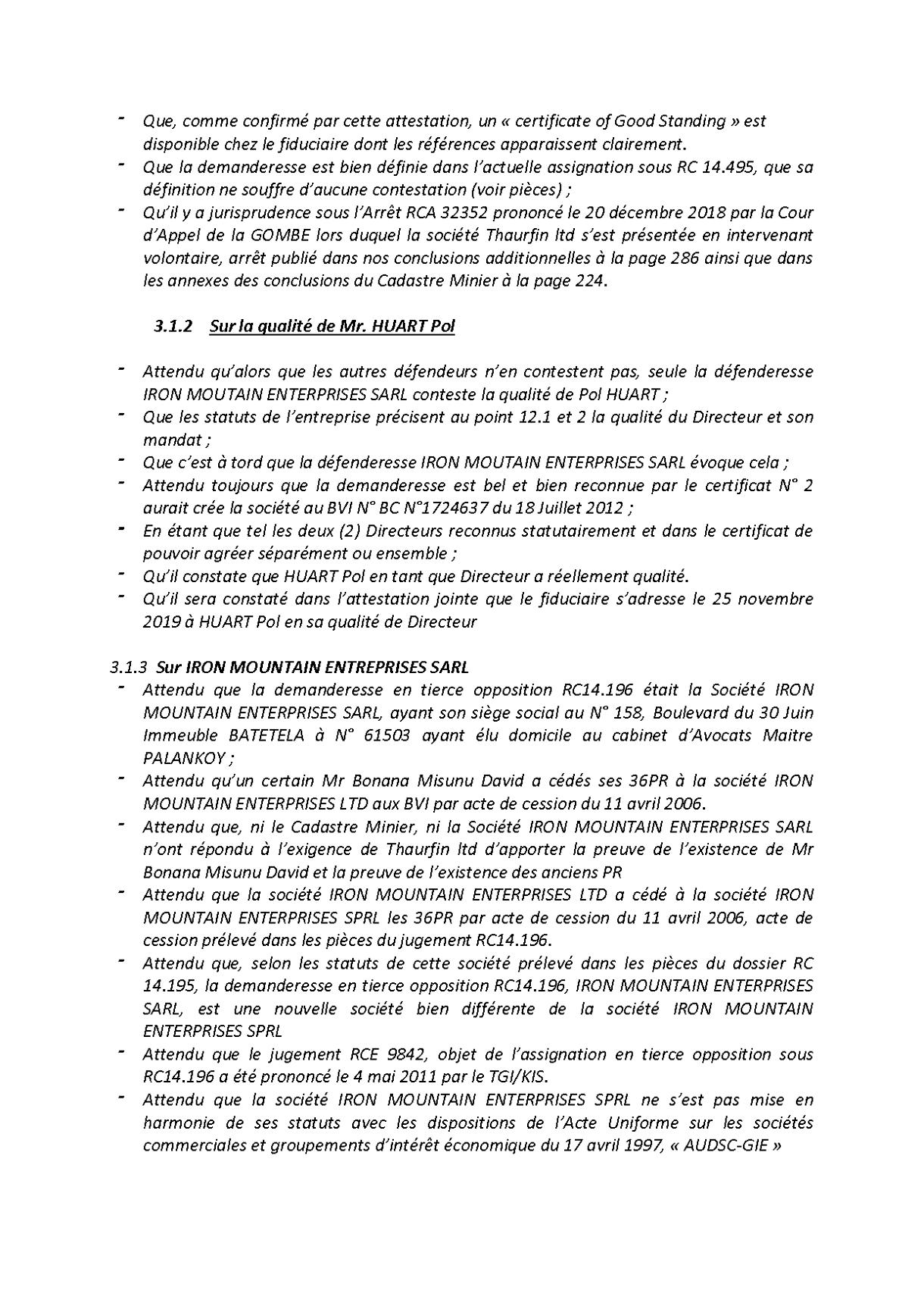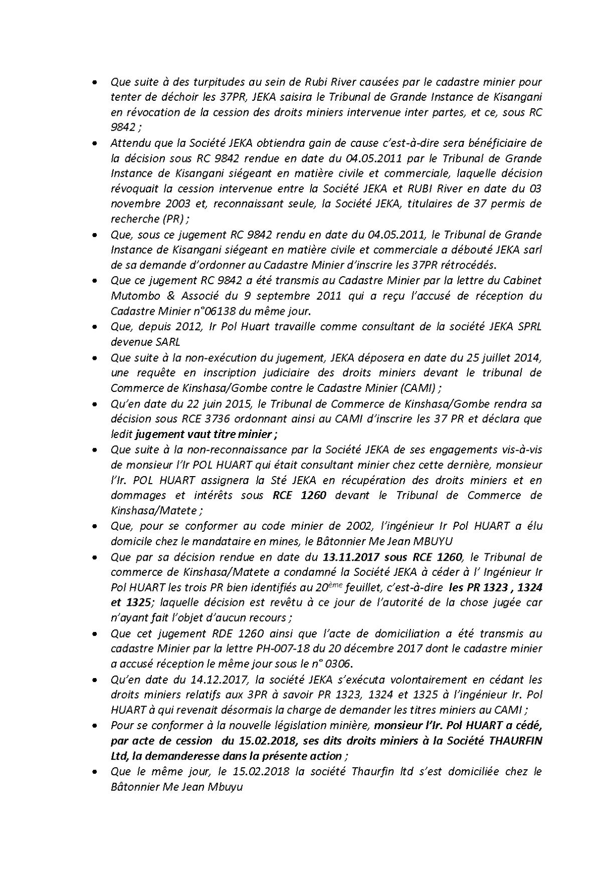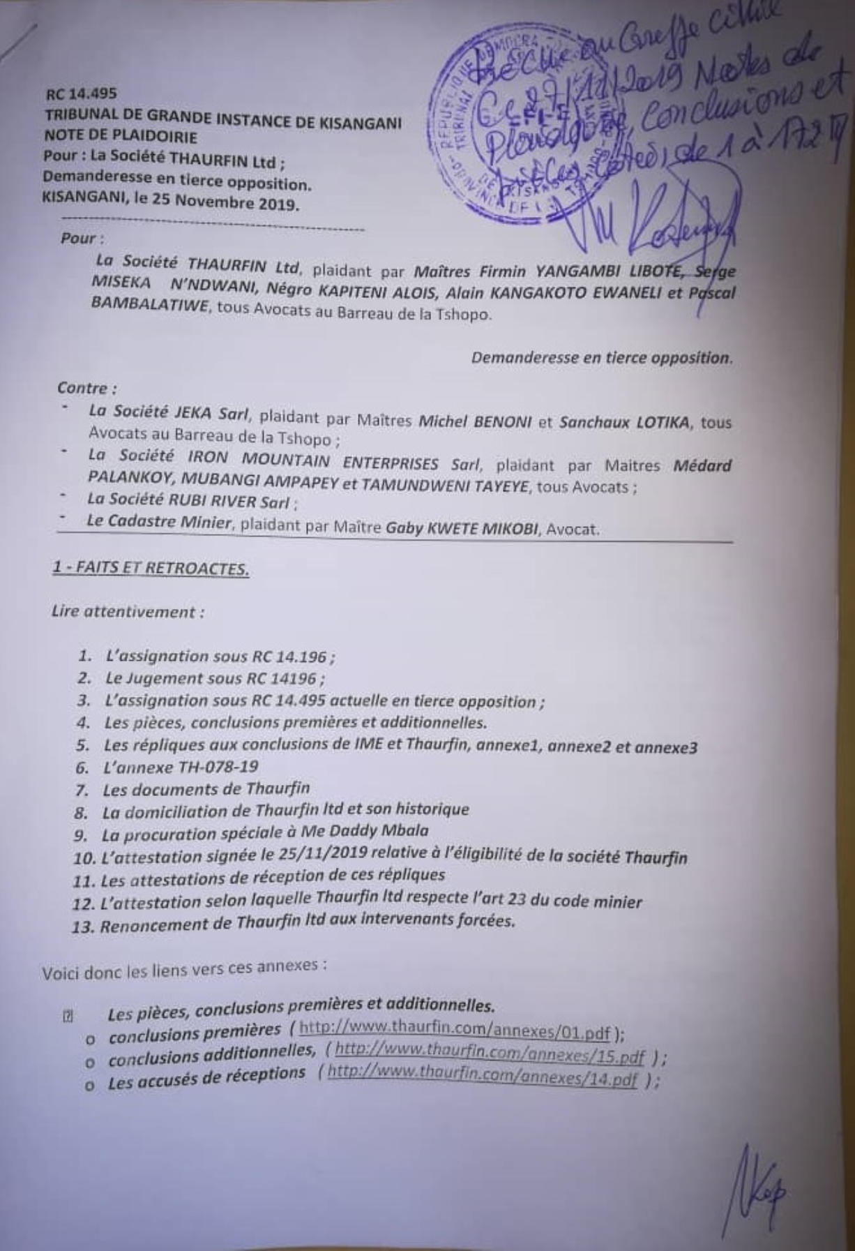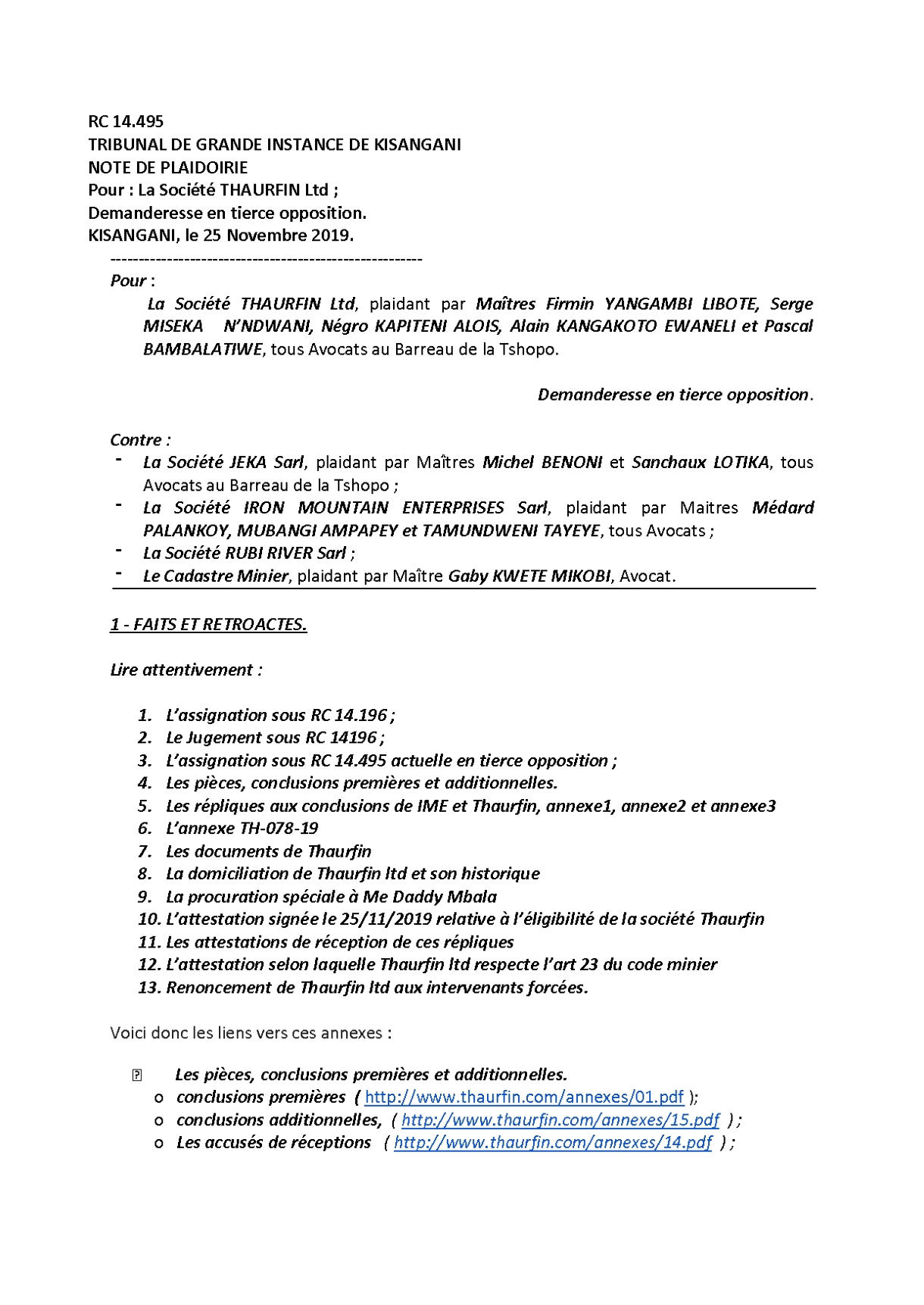 RC 14.495TRIBUNAL DE GRANDE INSTANCE DE KISANGANINOTE DE PLAIDOIRIEPour : La Société THAURFIN Ltd ;Demanderesse en tierce opposition.KISANGANI, le 25 Novembre 2019.-------------------------------------------------------Pour :LaSociétéTHAURFINLtd,plaidantparMaîtresFirminYANGAMBILIBOTE,SergeMISEKAN’NDWANI,NégroKAPITENIALOIS,AlainKANGAKOTOEWANELIetPascalBAMBALATIWE, tous Avocats au Barreau de la Tshopo. Demanderesse en tierce opposition.Contre : ־La Société JEKA Sarl, plaidant par Maîtres Michel BENONI et Sanchaux LOTIKA, tous Avocats au Barreau de la Tshopo ;־La Société IRON MOUNTAIN ENTERPRISES Sarl, plaidant par Maitres Médard PALANKOY, MUBANGI AMPAPEY et TAMUNDWENI TAYEYE, tous Avocats ;־La Société RUBI RIVER Sarl ;־Le Cadastre Minier, plaidant par Maître Gaby KWETE MIKOBI, Avocat.1 - FAITS ET RETROACTES.Lire attentivement :1.L’assignation sous RC 14.196 ;2.Le Jugement sous RC 14196 ;3.L’assignation sous RC 14.495 actuelle en tierce opposition ;4.Les pièces, conclusions premières et additionnelles.5.Les répliques aux conclusions de IME et Thaurfin, annexe1, annexe2 et annexe36.L’annexe TH-078-197.Les documents de Thaurfin8.La domiciliation de Thaurfin ltd et son historique9.La procuration spéciale à Me Daddy Mbala 10.L’attestation signée le 25/11/2019 relative à l’éligibilité de la société Thaurfin11.Les attestations de réception de ces répliques12.L’attestation selon laquelle Thaurfin ltd respecte l’art 23 du code minier13.Renoncement de Thaurfin ltd aux intervenants forcées.Voici donc les liens vers ces annexes :Les pièces, conclusions premières et additionnelles.o conclusions premières ( http://www.thaurfin.com/annexes/01.pdf );o conclusions additionnelles, ( http://www.thaurfin.com/annexes/15.pdf ) ;o Les accusés de réceptions ( http://www.thaurfin.com/annexes/14.pdf ) ; Les répliques aux conclusions de IME et Thaurfin, et ses annexeso Les répliques , ( http://www.thaurfin.com/annexes/02.pdf ) ;o Annexe 1 de ces répliques, ( http://www.thaurfin.com/annexes/03.pdf ) ;o Annexe 2 de ces répliques, ( http://www.thaurfin.com/annexes/04.pdf ) ;o Annexe 3 de ces répliques, ( http://www.thaurfin.com/annexes/05.pdf ) ; o La procuration spéciale à Me Daddy Mba ( http://www.thaurfin.com/annexes/09.pdf ) ; o Les attestations de réception de ces répliques ( http://www.thaurfin.com/annexes/11.pdf ) ; o La synthèse TH-078-19 ( http://www.thaurfin.com/annexes/06.pdf ) ; o Les documents de Thaurfin ltd ( http://www.thaurfin.com/annexes/08.pdf ) ; o La domiciliation de Thaurfin ltd et son historique ( http://www.thaurfin.com/annexes/07.pdf ) o L’attestation relative à l’éligibilité de la société Thaurfin ( http://www.thaurfin.com/annexes/12.pdf ) o Renoncement de Thaurfin ltd aux intervenants forcées ( http://www.thaurfin.com/annexes/13.pdf )Dont voici une synthèse,Attendu qu’en date du 31 mars 1998 JEKA avait obtenu deux ZER (zone exclusive de recherche) ;Quelenouveaucodeminierayantétépromulguéle11juillet2002,endatedu9juillet2003(envertuduDécretn°038/2003,portantrèglementminierensesarticles580et 586),etleDECRETN°038/2003,PORTANTREGLEMENTMINIER,art580&586(AN07A)apermisauxtitulairesdeZERdetransformerleursancienspermisendéans3mois, càd jusqu’au 26 juin 2003.Quen’ayantpassaisicetteopportunitélasociétéJEKAavaitintroduitunedemandede43nouveauxPRdontnotammentlesPR1323,1324et1325lesquelsavaientreçulesn° temporaires 470, 471 et 472 Attenduqu’auxdatesdu09juilletainsiquedu15août2003serontrespectivementpayéslesfraisdedépôtdeces43PRainsiquelesfraisdedépôtpourcertificatdecapacité financière ;Que,suiteàuncontratdecessionavecdenouveauxassociéssignéle7octobre2003,laSociétéJEKAcédasesdroitsminiersàlanouvelleSociétéRUBIRIVERsprlenformation et qui sera constituée le 1er novembre 2003 ; Que le certificat de capacité financière a été délivré le 7 septembre 2004,Quelesaviscadastrauxfavorablespour37PRontétédélivrésàRubiRiverle10mars2005,attribuantlesn°définitifs1323,1324et1325pourles3PRenreplacementdesn° temporaire 470, 471 et 472 Ainsi donc, en date du 17 février 2006, le Ministre en charge des mines prendra des arrêtés délivrant les 37PR dont les PR.1323, 1324 et 1325 ;Attenduqu’endatedu30mars2006,RUBIRIVERtransféralasommede37.567,77USDauCAMI(4èmedéfendeur)autitredepaiementdestaxessuperficiairesdes37PRet, les quittances du paiement desdites taxes superficiaires seront délivrées à RUBI RIVER sprl par le CAMI en date du 2 mai 2006 ;QuesuiteàdesturpitudesauseindeRubiRivercauséesparlecadastreminierpourtenterdedéchoirles37PR,JEKAsaisiraleTribunaldeGrandeInstancedeKisanganien révocation de la cession des droits miniers intervenue inter partes, et ce, sous RC 9842 ;AttenduquelaSociétéJEKAobtiendragaindecausec’est-à-direserabénéficiairedeladécisionsousRC9842rendueendatedu04.05.2011parleTribunaldeGrandeInstance deKisanganisiégeantenmatièrecivileetcommerciale,laquelledécisionrévoquaitlacessionintervenueentrelaSociétéJEKAetRUBIRiverendatedu03novembre2003et, reconnaissant seule, la Société JEKA, titulaires de 37 permis de recherche (PR) ;Que,souscejugementRC9842renduendatedu04.05.2011,leTribunaldeGrandeInstancedeKisanganisiégeantenmatièrecivileetcommercialeadéboutéJEKAsarldesa demande d’ordonner au Cadastre Minier d’inscrire les 37PR rétrocédés.QuecejugementRC9842aététransmisauCadastreMinierparlalettreduCabinetMutombo&Associédu9septembre2011quiareçul’accuséderéceptionduCadastre Minier n°06138 du même jour.Que, depuis 2012, Ir Pol Huart travaille comme consultant de la société JEKA SPRL devenue SARLQuesuiteàlanon-exécutiondujugement,JEKAdéposeraendatedu25juillet2014,unerequêteeninscriptionjudiciairedesdroitsminiersdevantletribunaldeCommercede Kinshasa/Gombe contre le Cadastre Minier (CAMI) ;Qu’endatedu22juin2015,leTribunaldeCommercedeKinshasa/GomberendrasadécisionsousRCE3736ordonnantainsiauCAMId’inscrireles37PRetdéclaraqueledit jugement vaut ti