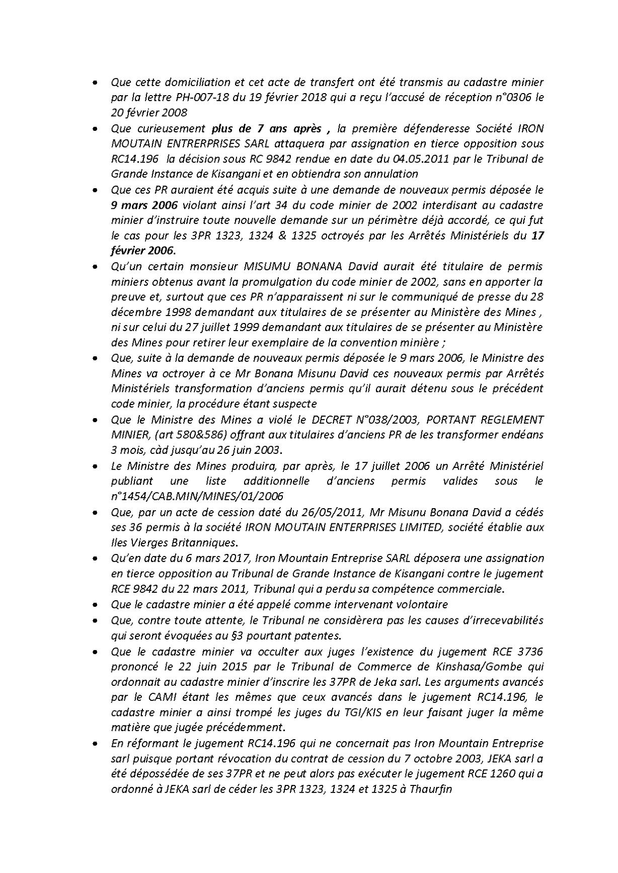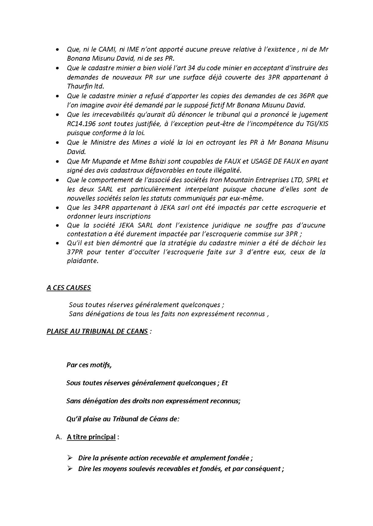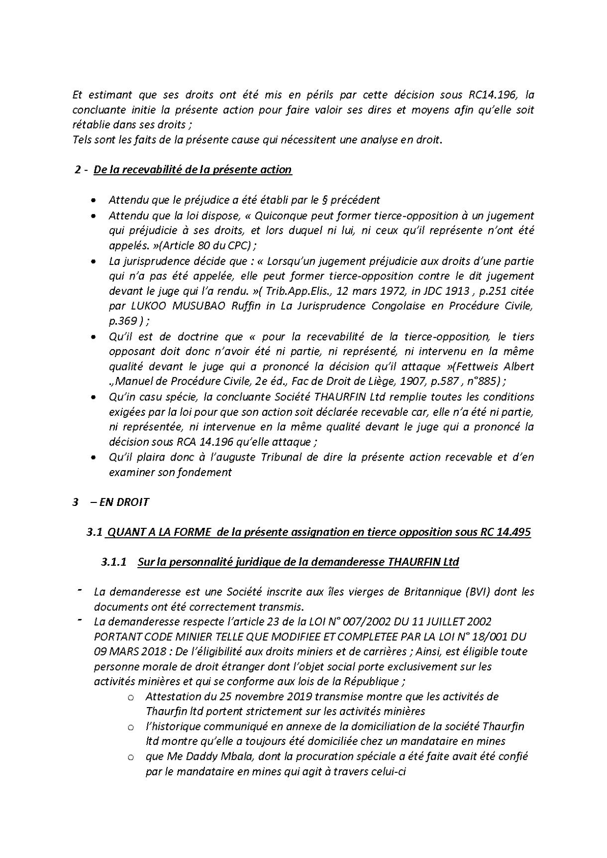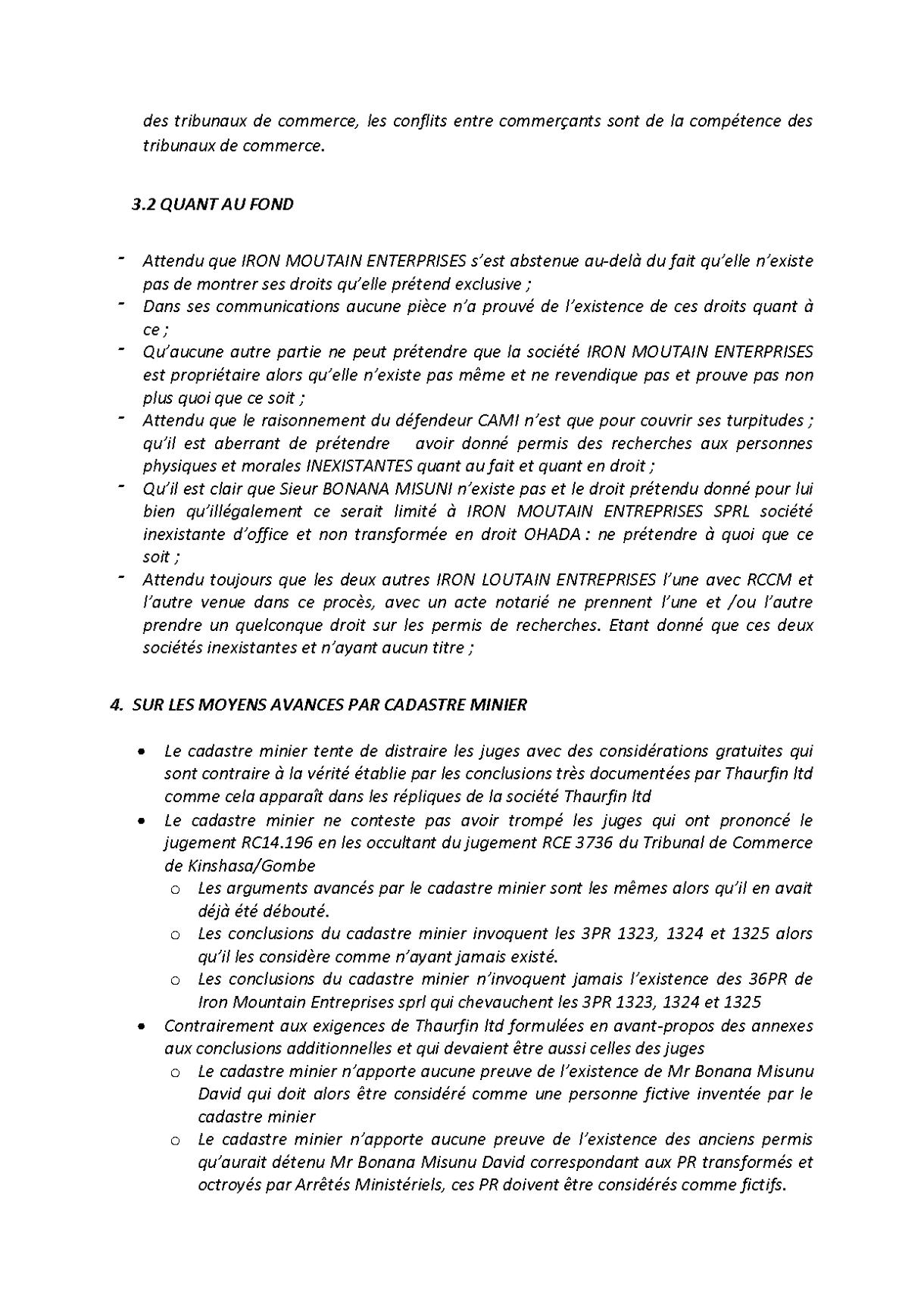 RC 14.495TRIBUNAL DE GRANDE INSTANCE DE KISANGANINOTE DE PLAIDOIRIEPour : La Société THAURFIN Ltd ;Demanderesse en tierce opposition.KISANGANI, le 25 Novembre 2019.-------------------------------------------------------Pour :LaSociétéTHAURFINLtd,plaidantparMaîtresFirminYANGAMBILIBOTE,SergeMISEKAN’NDWANI,NégroKAPITENIALOIS,AlainKANGAKOTOEWANELIetPascalBAMBALATIWE, tous Avocats au Barreau de la Tshopo. Demanderesse en tierce opposition.Contre : ־La Société JEKA Sarl, plaidant par Maîtres Michel BENONI et Sanchaux LOTIKA, tous Avocats au Barreau de la Tshopo ;־La Société IRON MOUNTAIN ENTERPRISES Sarl, plaidant par Maitres Médard PALANKOY, MUBANGI AMPAPEY et TAMUNDWENI TAYEYE, tous Avocats ;־La Société RUBI RIVER Sarl ;־Le Cadastre Minier, plaidant par Maître Gaby KWETE MIKOBI, Avocat.1 - FAITS ET RETROACTES.Lire attentivement :1.L’assignation sous RC 14.196 ;2.Le Jugement sous RC 14196 ;3.L’assignation sous RC 14.495 actuelle en tierce opposition ;4.Les pièces, conclusions premières et additionnelles.5.Les répliques aux conclusions de IME et Thaurfin, annexe1, annexe2 et annexe36.L’annexe TH-078-197.Les documents de Thaurfin8.La domiciliation de Thaurfin ltd et son historique9.La procuration spéciale à Me Daddy Mbala 10.L’attestation signée le 25/11/2019 relative à l’éligibilité de la société Thaurfin11.Les attestations de réception de ces répliques12.L’attestation selon laquelle Thaurfin ltd respecte l’art 23 du code minier13.Renoncement de Thaurfin ltd aux intervenants forcées.Voici donc les liens vers ces annexes :Les pièces, conclusions premières et additionnelles.o conclusions premières ( http://www.thaurfin.com/annexes/01.pdf );o conclusions additionnelles, ( http://www.thaurfin.com/annexes/15.pdf ) ;o Les accusés de réceptions ( http://www.thaurfin.com/annexes/14.pdf ) ; Les répliques aux conclusions de IME et Thaurfin, et ses annexeso Les répliques , ( http://www.thaurfin.com/annexes/02.pdf ) ;o Annexe 1 de ces répliques, ( http://www.thaurfin.com/annexes/03.pdf ) ;o Annexe 2 de ces répliques, ( http://www.thaurfin.com/annexes/04.pdf ) ;o Annexe 3 de ces répliques, ( http://www.thaurfin.com/annexes/05.pdf ) ; o La procuration spéciale à Me Daddy Mba ( http://www.thaurfin.com/annexes/09.pdf ) ; o Les attestations de réception de ces répliques ( http://www.thaurfin.com/annexes/11.pdf ) ; o La synthèse TH-078-19 ( http://www.thaurfin.com/annexes/06.pdf ) ; o Les documents de Thaurfin ltd ( http://www.thaurfin.com/annexes/08.pdf ) ; o La domiciliation de Thaurfin ltd et son historique ( http://www.thaurfin.com/annexes/07.pdf ) o L’attestation relative à l’éligibilité de la société Thaurfin ( http://www.thaurfin.com/annexes/12.pdf ) o Renoncement de Thaurfin ltd aux intervenants forcées ( http://www.thaurfin.com/annexes/13.pdf )Dont voici une synthèse,Attendu qu’en date du 31 mars 1998 JEKA avait obtenu deux ZER (zone exclusive de recherche) ;Quelenouveaucodeminierayantétépromulguéle11juillet2002,endatedu9juillet2003(envertuduDécretn°038/2003,portantrèglementminierensesarticles580et 586),etleDECRETN°038/2003,PORTANTREGLEMENTMINIER,art580&586(AN07A)apermisauxtitulairesdeZERdetransformerleursancienspermisendéans3mois, càd jusqu’au 26 juin 2003.Quen’ayantpassaisicetteopportunitélasociétéJEKAavaitintroduitunedemandede43nouveauxPRdontnotammentlesPR1323,1324et1325lesquelsavaientreçulesn° temporaires 470, 471 et 472 Attenduqu’auxdatesdu09juilletainsiquedu15août2003serontrespectivementpayéslesfraisdedépôtdeces43PRainsiquelesfraisdedépôtpourcertificatdecapacité financière ;Que,suiteàuncontratdecessionavecdenouveauxassociéssignéle7octobre2003,laSociétéJEKAcédasesdroitsminiersàlanouvelleSociétéRUBIRIVERsprlenformation et qui sera constituée le 1er novembre 2003 ; Que le certificat de capacité financière a été délivré le 7 septembre 2004,Quelesaviscadastrauxfavorablespour37PRontétédélivrésàRubiRiverle10mars2005,attribuantlesn°définitifs1323,1324et1325pourles3PRenreplacementdesn° temporaire 470, 471 et 472 Ainsi donc, en date du 17 février 2006, le Ministre en charge des mines prendra des arrêtés délivrant les 37PR dont les PR.1323, 1324 et 1325 ;Attenduqu’endatedu30mars2006,RUBIRIVERtransféralasommede37.567,77USDauCAMI(4èmedéfendeur)autitredepaiementdestaxessuperficiairesdes37PRet, les quittances du paiement desdites taxes superficiaires seront délivrées à RUBI RIVER sprl par le CAMI en date du 2 mai 2006 ;QuesuiteàdesturpitudesauseindeRubiRivercauséesparlecadastreminierpourtenterdedéchoirles37PR,JEKAsaisiraleTribunaldeGrandeInstancedeKisanganien révocation de la cession des droits miniers intervenue inter partes, et ce, sous RC 9842 ;AttenduquelaSociétéJEKAobtiendragaindecausec’est-à-direserabénéficiairedeladécisionsousRC9842rendueendatedu04.05.2011parleTribunaldeGrandeInstance deKisanganisiégeantenmatièrecivileetcommerciale,laquelledécisionrévoquaitlacessionintervenueentrelaSociétéJEKAetRUBIRiverendatedu03novembre2003et, reconnaissant seule, la Société JEKA, titulaires de 37 permis de recherche (PR) ;Que,souscejugementRC9842renduendatedu04.05.2011,leTribunaldeGrandeInstancedeKisanganisiégeantenmatièrecivileetcommercialeadéboutéJEKAsarldesa demande d’ordonner au Cadastre Minier d’inscrire les 37PR rétrocédés.QuecejugementRC9842aététransmisauCadastreMinierparlalettreduCabinetMutombo&Associédu9septembre2011quiareçul’accuséderéceptionduCadastre Minier n°06138 du même jour.Que, depuis 2012, Ir Pol Huart travaille comme consultant de la société JEKA SPRL devenue SARLQuesuiteàlanon-exécutiondujugement,JEKAdéposeraendatedu25juillet2014,unerequêteeninscriptionjudiciairedesdroitsminiersdevantletribunaldeCommercede Kinshasa/Gombe contre le Cadastre Minier (CAMI) ;Qu’endatedu22juin2015,leTribunaldeCommercedeKinshasa/GomberendrasadécisionsousRCE3736ordonnantainsiauCAMId’inscrireles37PRetdéclaraqueledit jugement vaut ti