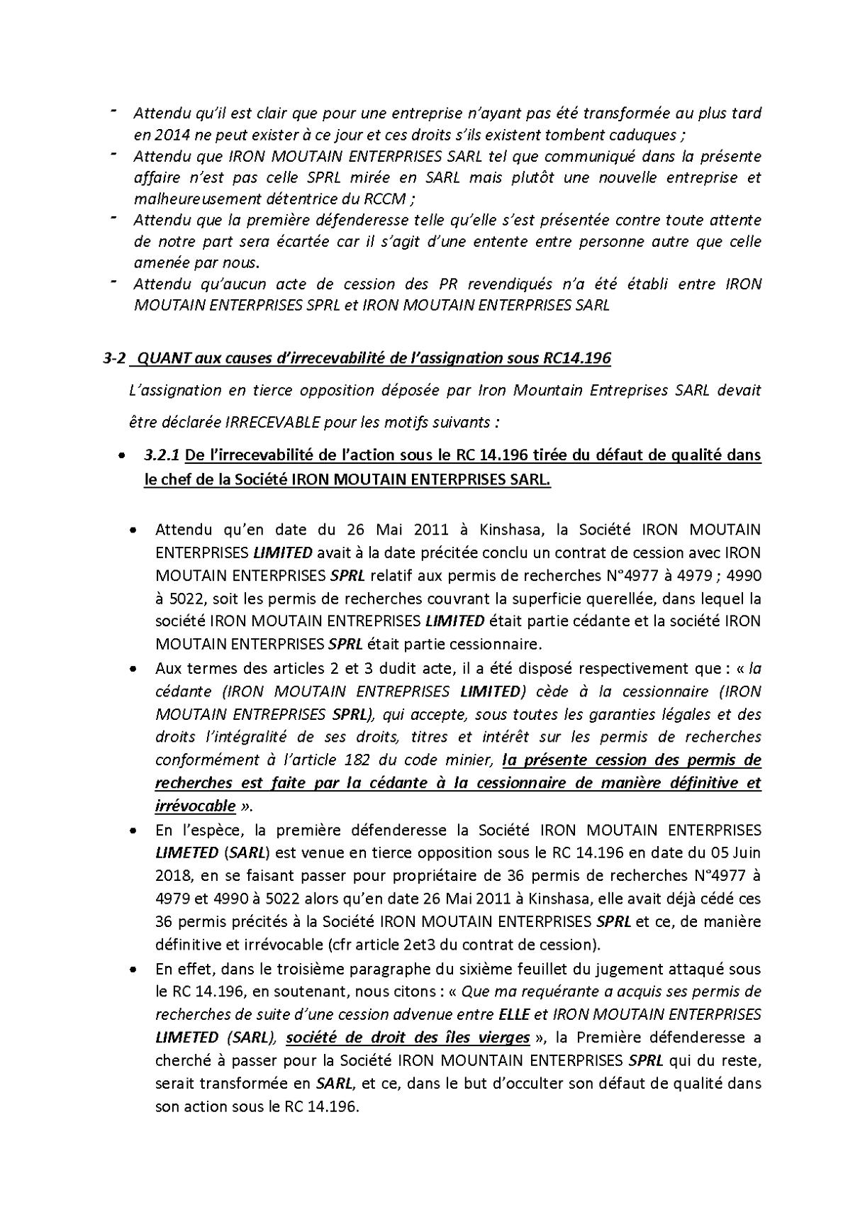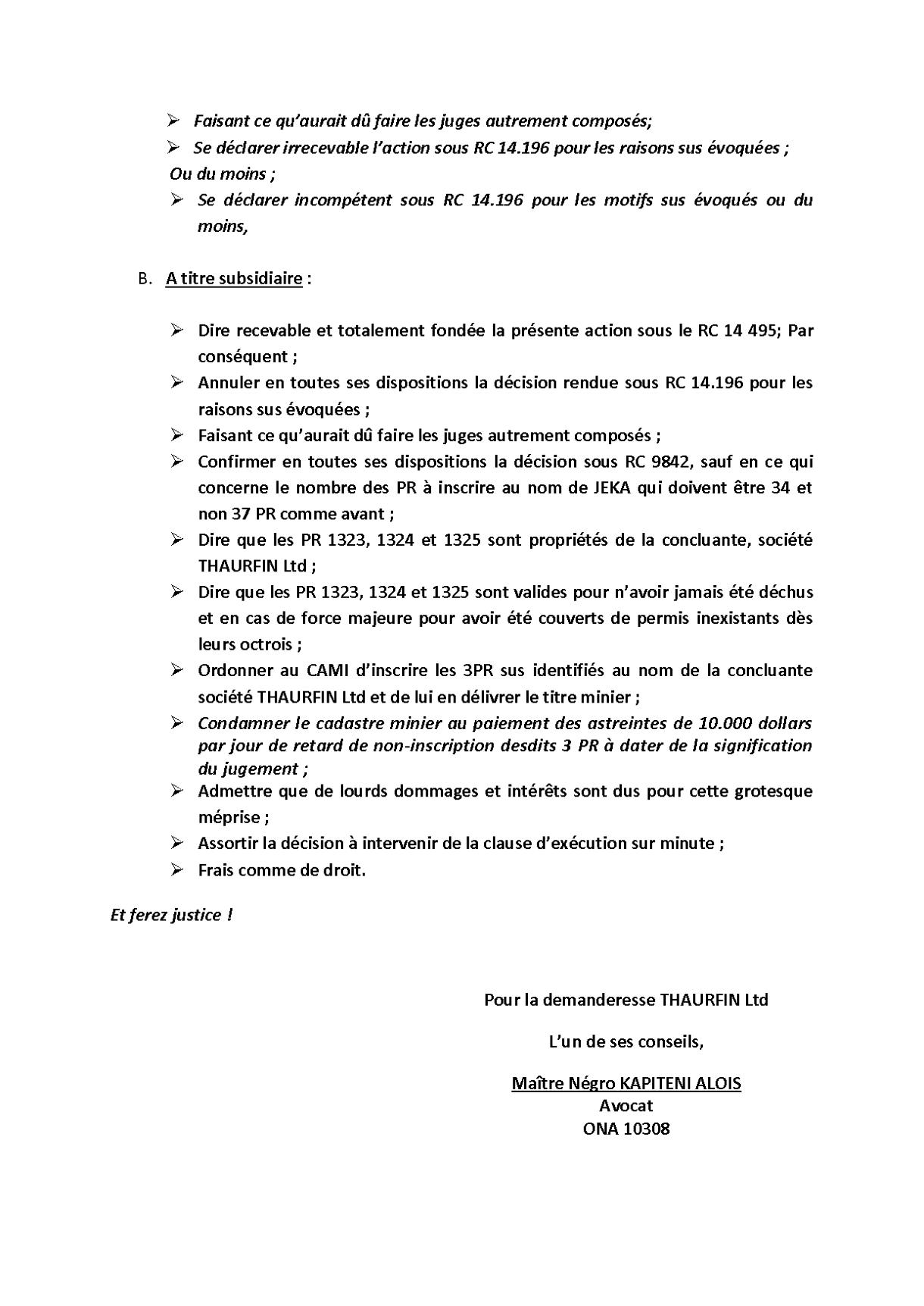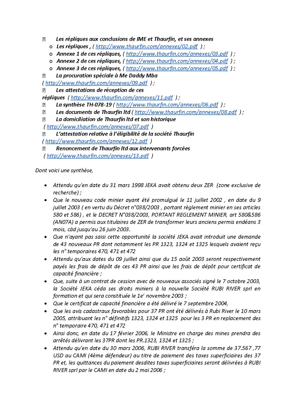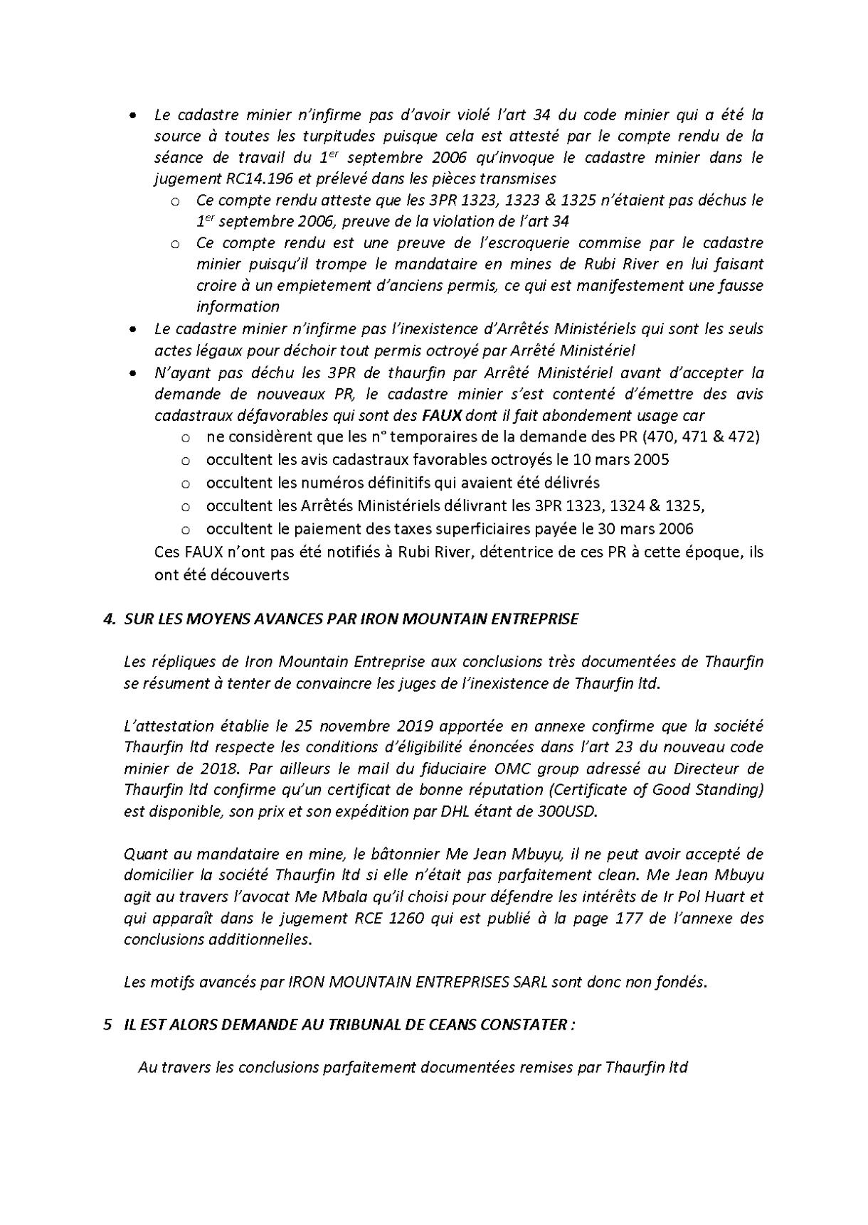 RC 14.495TRIBUNAL DE GRANDE INSTANCE DE KISANGANINOTE DE PLAIDOIRIEPour : La Société THAURFIN Ltd ;Demanderesse en tierce opposition.KISANGANI, le 25 Novembre 2019.-------------------------------------------------------Pour :LaSociétéTHAURFINLtd,plaidantparMaîtresFirminYANGAMBILIBOTE,SergeMISEKAN’NDWANI,NégroKAPITENIALOIS,AlainKANGAKOTOEWANELIetPascalBAMBALATIWE, tous Avocats au Barreau de la Tshopo. Demanderesse en tierce opposition.Contre : ־La Société JEKA Sarl, plaidant par Maîtres Michel BENONI et Sanchaux LOTIKA, tous Avocats au Barreau de la Tshopo ;־La Société IRON MOUNTAIN ENTERPRISES Sarl, plaidant par Maitres Médard PALANKOY, MUBANGI AMPAPEY et TAMUNDWENI TAYEYE, tous Avocats ;־La Société RUBI RIVER Sarl ;־Le Cadastre Minier, plaidant par Maître Gaby KWETE MIKOBI, Avocat.1 - FAITS ET RETROACTES.Lire attentivement :1.L’assignation sous RC 14.196 ;2.Le Jugement sous RC 14196 ;3.L’assignation sous RC 14.495 actuelle en tierce opposition ;4.Les pièces, conclusions premières et additionnelles.5.Les répliques aux conclusions de IME et Thaurfin, annexe1, annexe2 et annexe36.L’annexe TH-078-197.Les documents de Thaurfin8.La domiciliation de Thaurfin ltd et son historique9.La procuration spéciale à Me Daddy Mbala 10.L’attestation signée le 25/11/2019 relative à l’éligibilité de la société Thaurfin11.Les attestations de réception de ces répliques12.L’attestation selon laquelle Thaurfin ltd respecte l’art 23 du code minier13.Renoncement de Thaurfin ltd aux intervenants forcées.Voici donc les liens vers ces annexes :Les pièces, conclusions premières et additionnelles.o conclusions premières ( http://www.thaurfin.com/annexes/01.pdf );o conclusions additionnelles, ( http://www.thaurfin.com/annexes/15.pdf ) ;o Les accusés de réceptions ( http://www.thaurfin.com/annexes/14.pdf ) ; Les répliques aux conclusions de IME et Thaurfin, et ses annexeso Les répliques , ( http://www.thaurfin.com/annexes/02.pdf ) ;o Annexe 1 de ces répliques, ( http://www.thaurfin.com/annexes/03.pdf ) ;o Annexe 2 de ces répliques, ( http://www.thaurfin.com/annexes/04.pdf ) ;o Annexe 3 de ces répliques, ( http://www.thaurfin.com/annexes/05.pdf ) ; o La procuration spéciale à Me Daddy Mba ( http://www.thaurfin.com/annexes/09.pdf ) ; o Les attestations de réception de ces répliques ( http://www.thaurfin.com/annexes/11.pdf ) ; o La synthèse TH-078-19 ( http://www.thaurfin.com/annexes/06.pdf ) ; o Les documents de Thaurfin ltd ( http://www.thaurfin.com/annexes/08.pdf ) ; o La domiciliation de Thaurfin ltd et son historique ( http://www.thaurfin.com/annexes/07.pdf ) o L’attestation relative à l’éligibilité de la société Thaurfin ( http://www.thaurfin.com/annexes/12.pdf ) o Renoncement de Thaurfin ltd aux intervenants forcées ( http://www.thaurfin.com/annexes/13.pdf )Dont voici une synthèse,Attendu qu’en date du 31 mars 1998 JEKA avait obtenu deux ZER (zone exclusive de recherche) ;Quelenouveaucodeminierayantétépromulguéle11juillet2002,endatedu9juillet2003(envertuduDécretn°038/2003,portantrèglementminierensesarticles580et 586),etleDECRETN°038/2003,PORTANTREGLEMENTMINIER,art580&586(AN07A)apermisauxtitulairesdeZERdetransformerleursancienspermisendéans3mois, càd jusqu’au 26 juin 2003.Quen’ayantpassaisicetteopportunitélasociétéJEKAavaitintroduitunedemandede43nouveauxPRdontnotammentlesPR1323,1324et1325lesquelsavaientreçulesn° temporaires 470, 471 et 472 Attenduqu’auxdatesdu09juilletainsiquedu15août2003serontrespectivementpayéslesfraisdedépôtdeces43PRainsiquelesfraisdedépôtpourcertificatdecapacité financière ;Que,suiteàuncontratdecessionavecdenouveauxassociéssignéle7octobre2003,laSociétéJEKAcédasesdroitsminiersàlanouvelleSociétéRUBIRIVERsprlenformation et qui sera constituée le 1er novembre 2003 ; Que le certificat de capacité financière a été délivré le 7 septembre 2004,Quelesaviscadastrauxfavorablespour37PRontétédélivrésàRubiRiverle10mars2005,attribuantlesn°définitifs1323,1324et1325pourles3PRenreplacementdesn° temporaire 470, 471 et 472 Ainsi donc, en date du 17 février 2006, le Ministre en charge des mines prendra des arrêtés délivrant les 37PR dont les PR.1323, 1324 et 1325 ;Attenduqu’endatedu30mars2006,RUBIRIVERtransféralasommede37.567,77USDauCAMI(4èmedéfendeur)autitredepaiementdestaxessuperficiairesdes37PRet, les quittances du paiement desdites taxes superficiaires seront délivrées à RUBI RIVER sprl par le CAMI en date du 2 mai 2006 ;QuesuiteàdesturpitudesauseindeRubiRivercauséesparlecadastreminierpourtenterdedéchoirles37PR,JEKAsaisiraleTribunaldeGrandeInstancedeKisanganien révocation de la cession des droits miniers intervenue inter partes, et ce, sous RC 9842 ;AttenduquelaSociétéJEKAobtiendragaindecausec’est-à-direserabénéficiairedeladécisionsousRC9842rendueendatedu04.05.2011parleTribunaldeGrandeInstance deKisanganisiégeantenmatièrecivileetcommerciale,laquelledécisionrévoquaitlacessionintervenueentrelaSociétéJEKAetRUBIRiverendatedu03novembre2003et, reconnaissant seule, la Société JEKA, titulaires de 37 permis de recherche (PR) ;Que,souscejugementRC9842renduendatedu04.05.2011,leTribunaldeGrandeInstancedeKisanganisiégeantenmatièrecivileetcommercialeadéboutéJEKAsarldesa demande d’ordonner au Cadastre Minier d’inscrire les 37PR rétrocédés.QuecejugementRC9842aététransmisauCadastreMinierparlalettreduCabinetMutombo&Associédu9septembre2011quiareçul’accuséderéceptionduCadastre Minier n°06138 du même jour.Que, depuis 2012, Ir Pol Huart travaille comme consultant de la société JEKA SPRL devenue SARLQuesuiteàlanon-exécutiondujugement,JEKAdéposeraendatedu25juillet2014,unerequêteeninscriptionjudiciairedesdroitsminiersdevantletribunaldeCommercede Kinshasa/Gombe contre le Cadastre Minier (CAMI) ;Qu’endatedu22juin2015,leTribunaldeCommercedeKinshasa/GomberendrasadécisionsousRCE3736ordonnantainsiauCAMId’inscrireles37PRetdéclaraqueledit jugement vaut ti