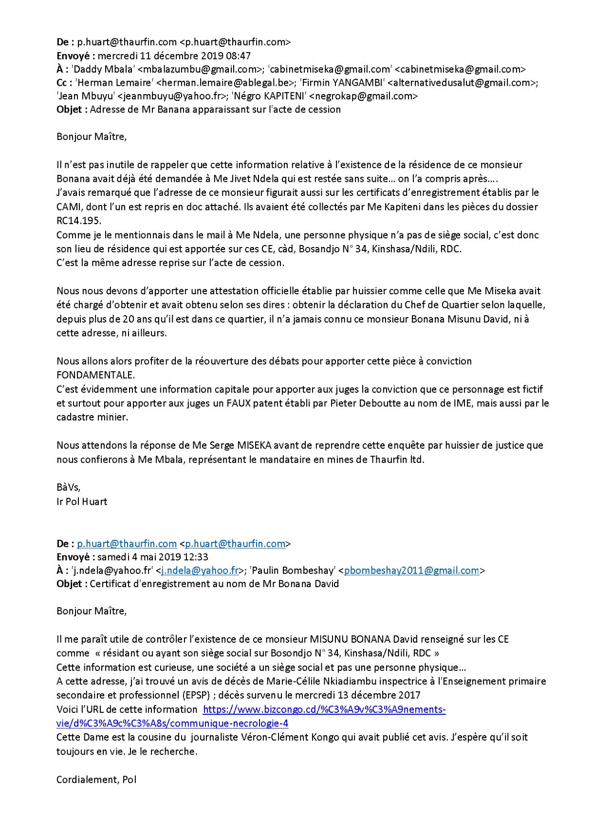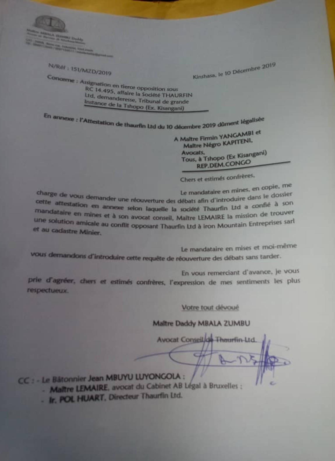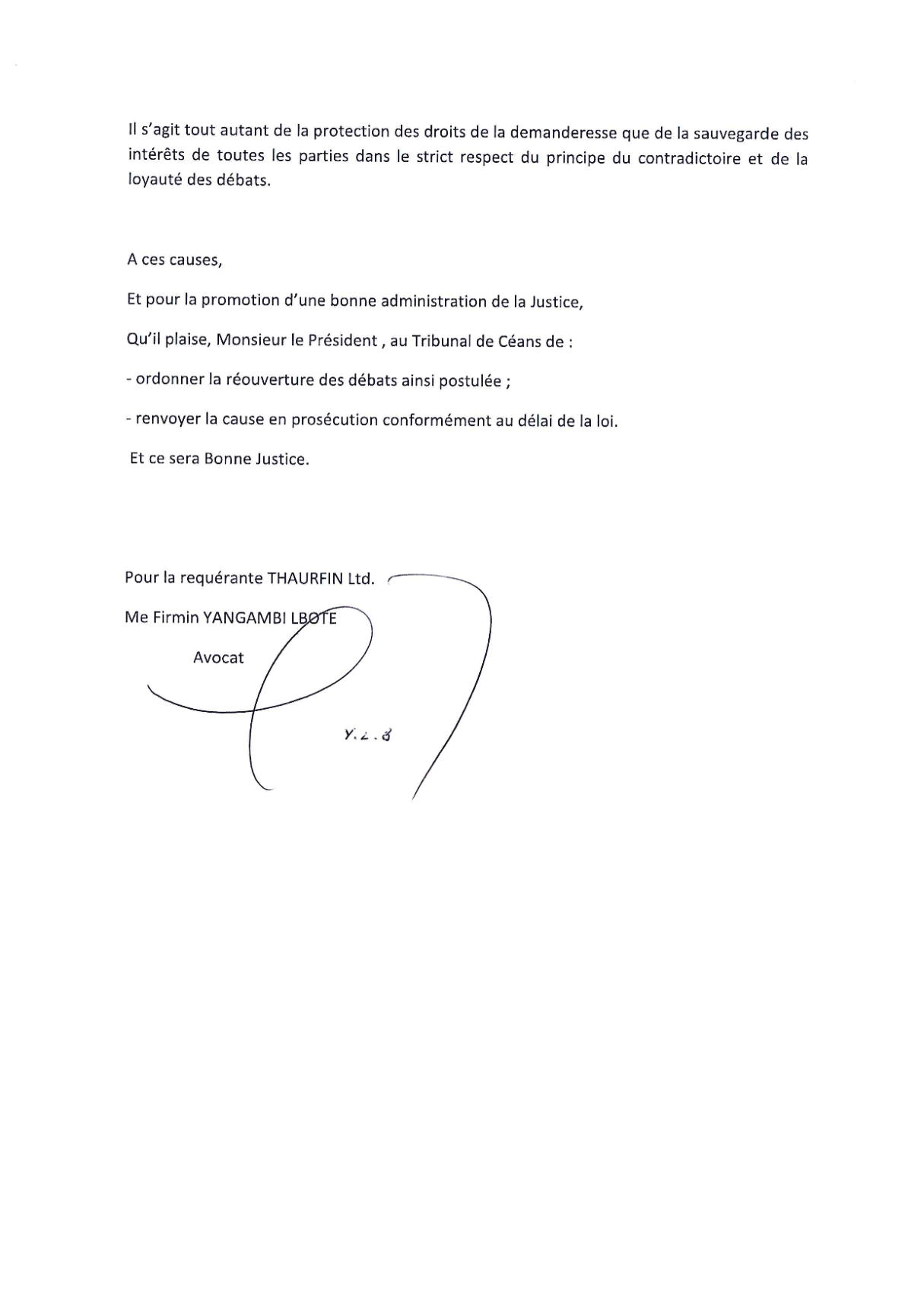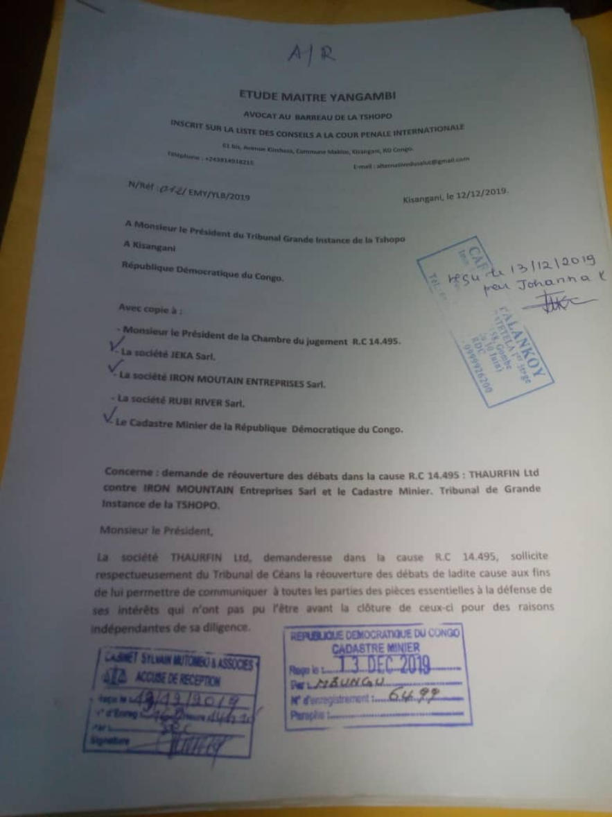 Le 10 décembre, Me Mbala demande à Me Firmin Yangambi d’établir une requête en réouverture des débats (calque)Le 12 décembre, la requête est établie et transmise au greffe qui l’accepte, le jugement n’étant pas prononcé (calque)Le 13 décembre, le Cadastre Minier National et par le Cabinet de Me Palankoy pour IME en accusent réception (calque)